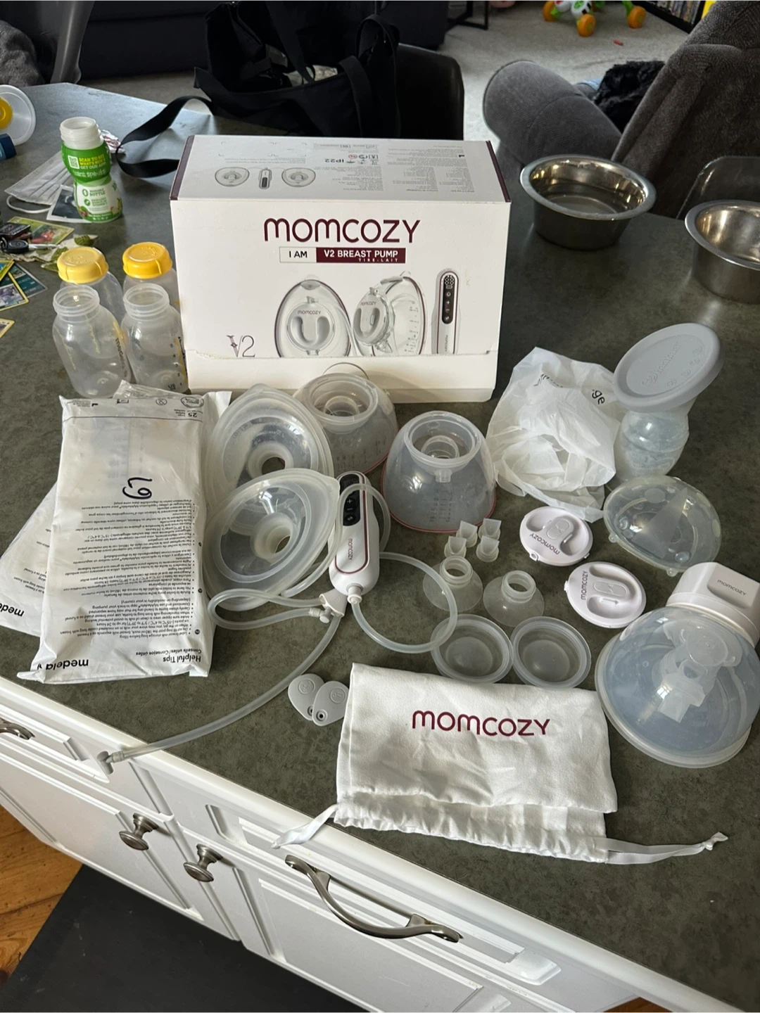 Selling a Momcozy I AM V2 Breast Pump. It comes with all the parts shown in the picture, including the Medela bags. Great for new parents!