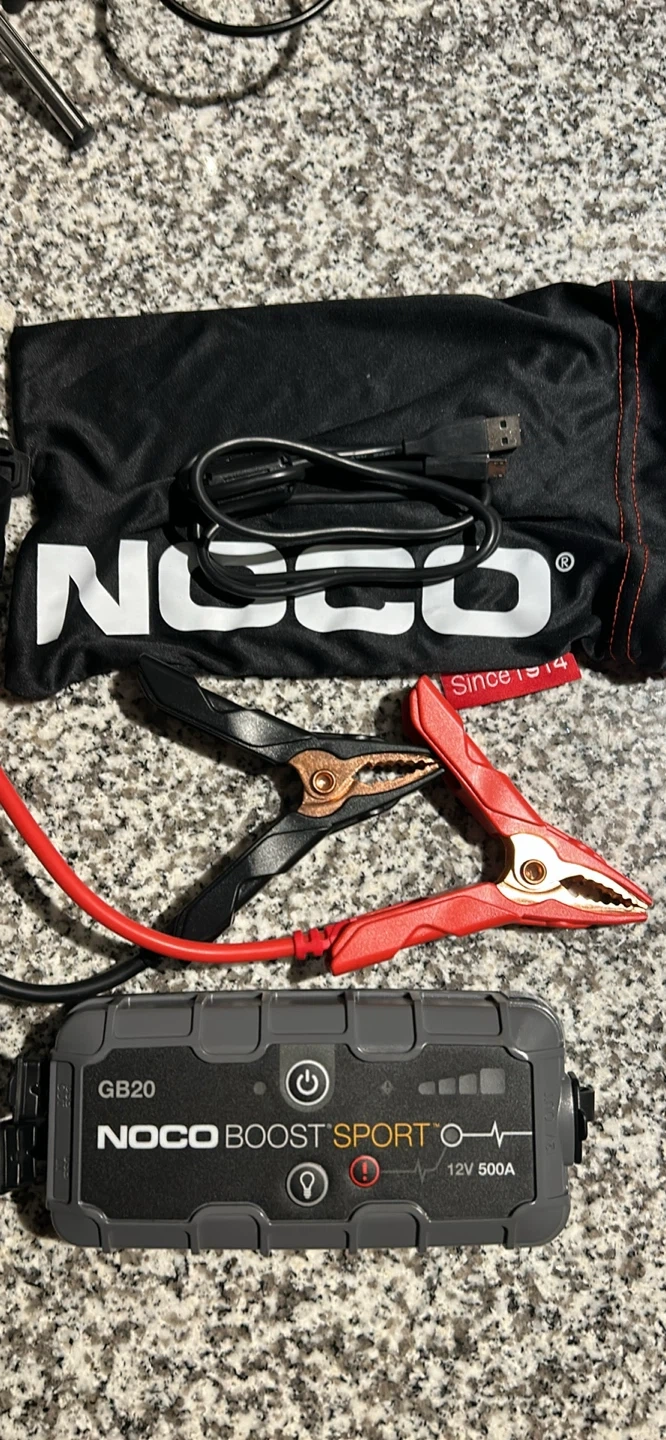 This is a NOCO GB20 Boost Sport jump starter. It's a 12V, 500A portable battery booster. Includes jumper cables, USB charging cable, and storage bag.