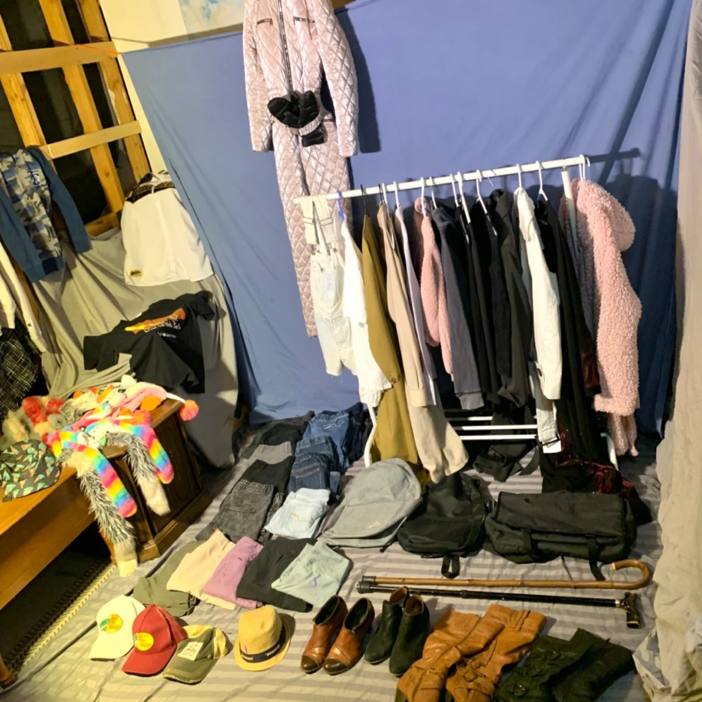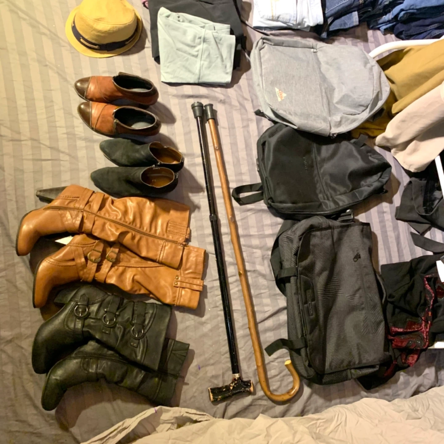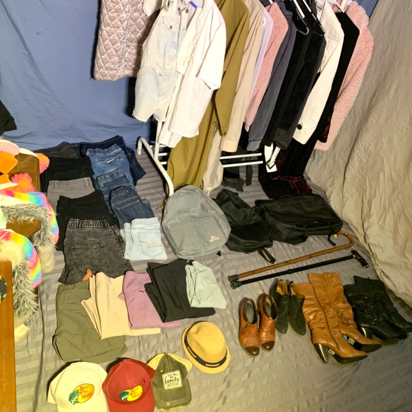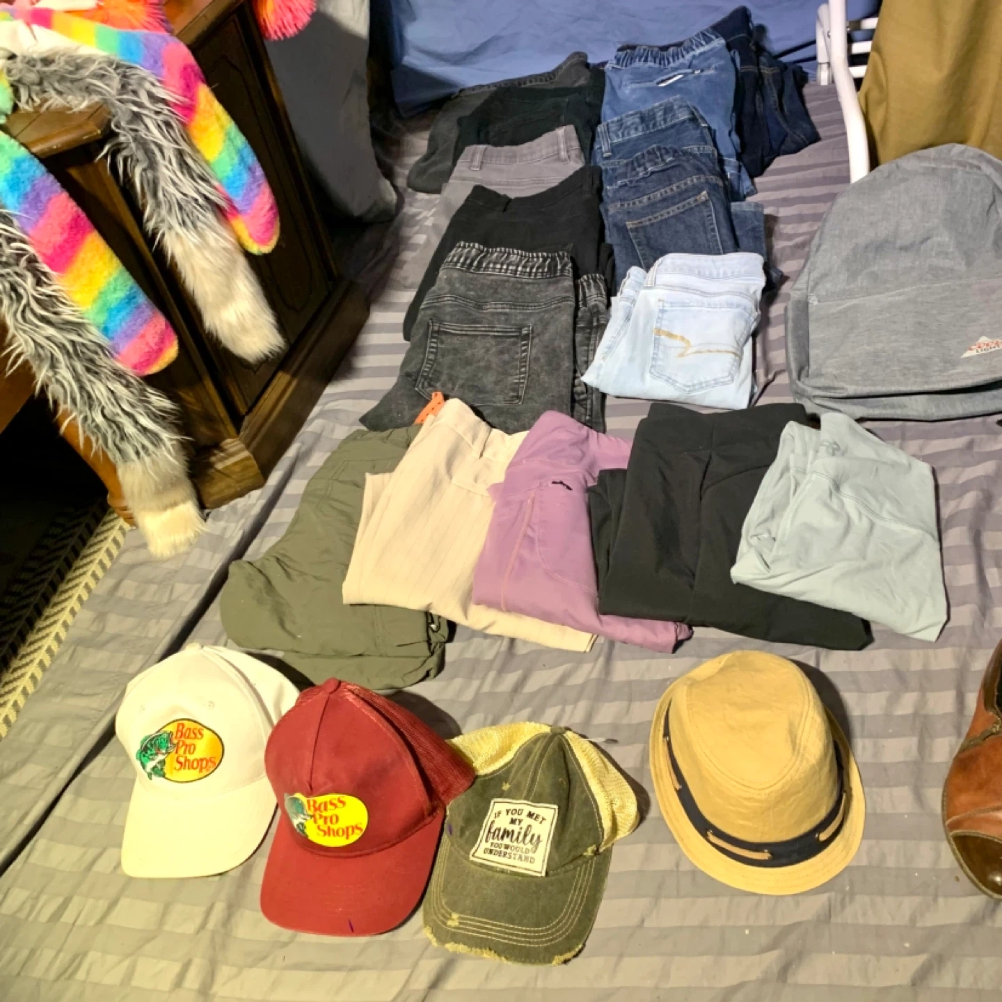 Clothing bundle including women’s clothing, men’s clothing, shoes, boots, hats, kids hats, shirts, sweaters, pants, jeans, bags, and more. Great mix of everyday fashion and accessories perfect for finding affordable items for different ages, styles, and seasons.
