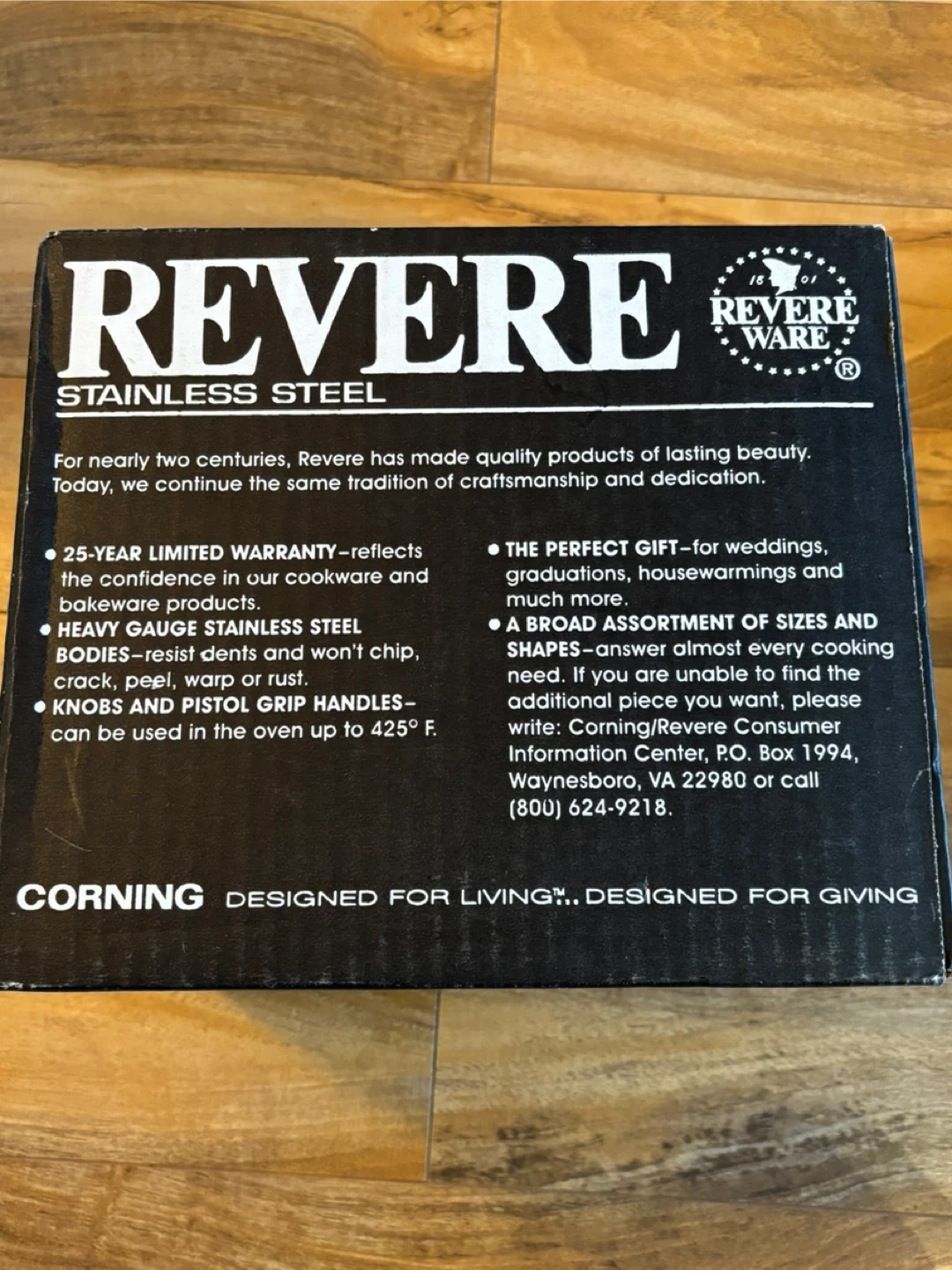 This vintage Revere Stainless Steel stockpot is 8 quarts and comes with a lid. It's a heavy gauge stainless steel with a copper clad bottom for even heat spreading. The pistol grip handles are oven safe up to 425°F. It's perfect for making large batches of soup or stew!