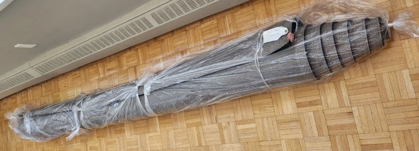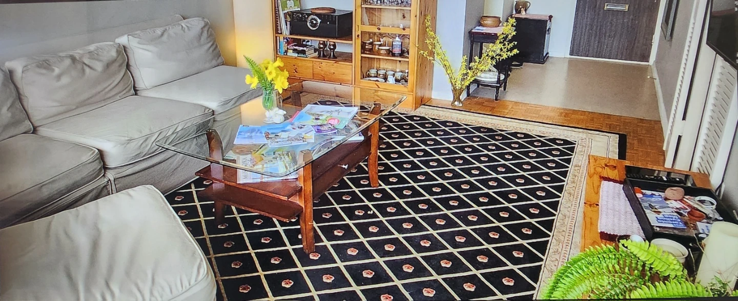 We are selling, beautiful, wool carpet. The color is black and cream,with burgundy colour roses.