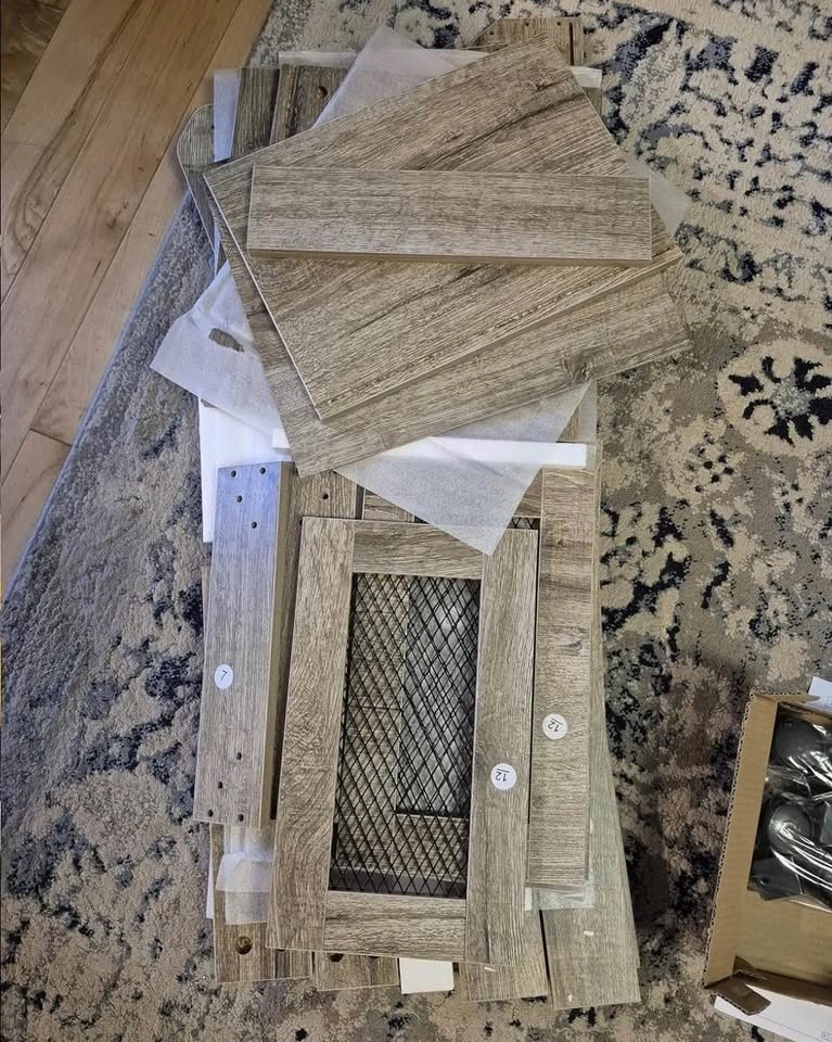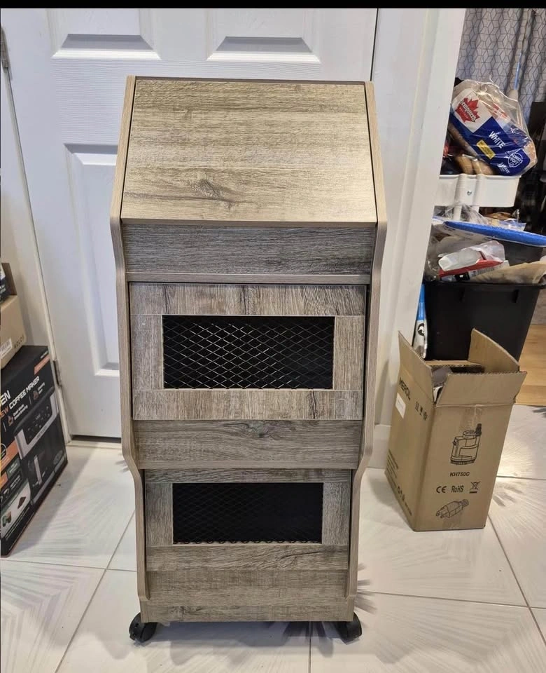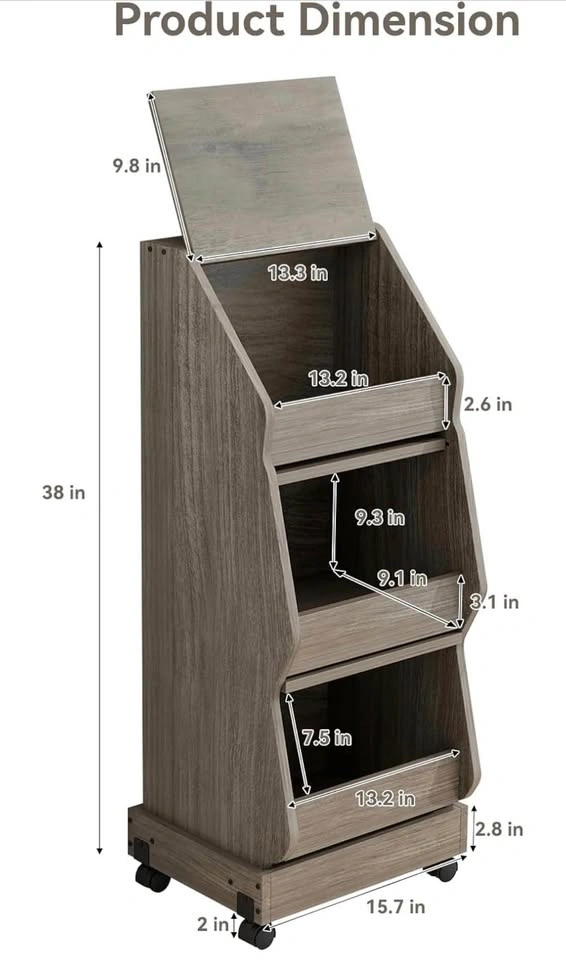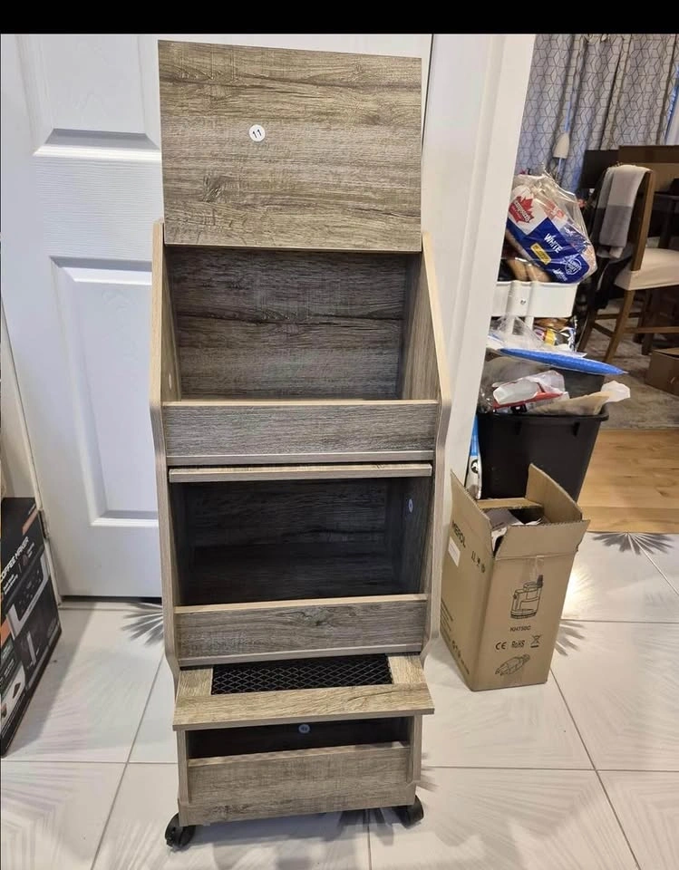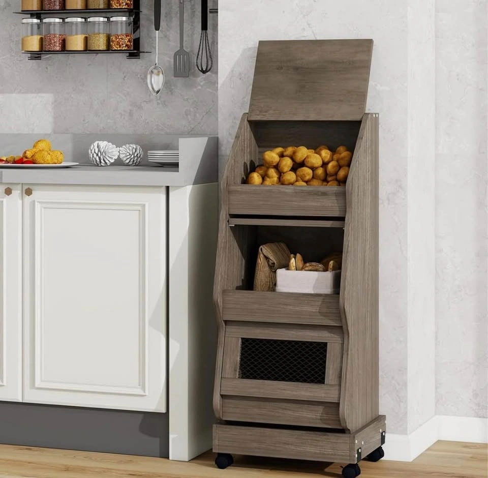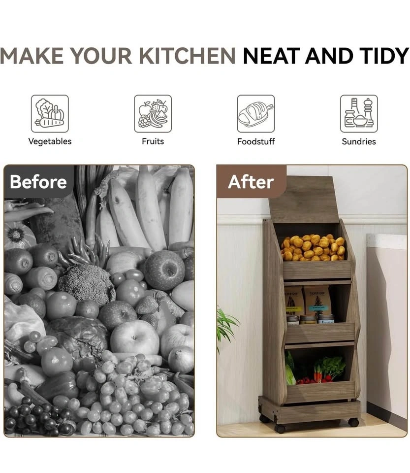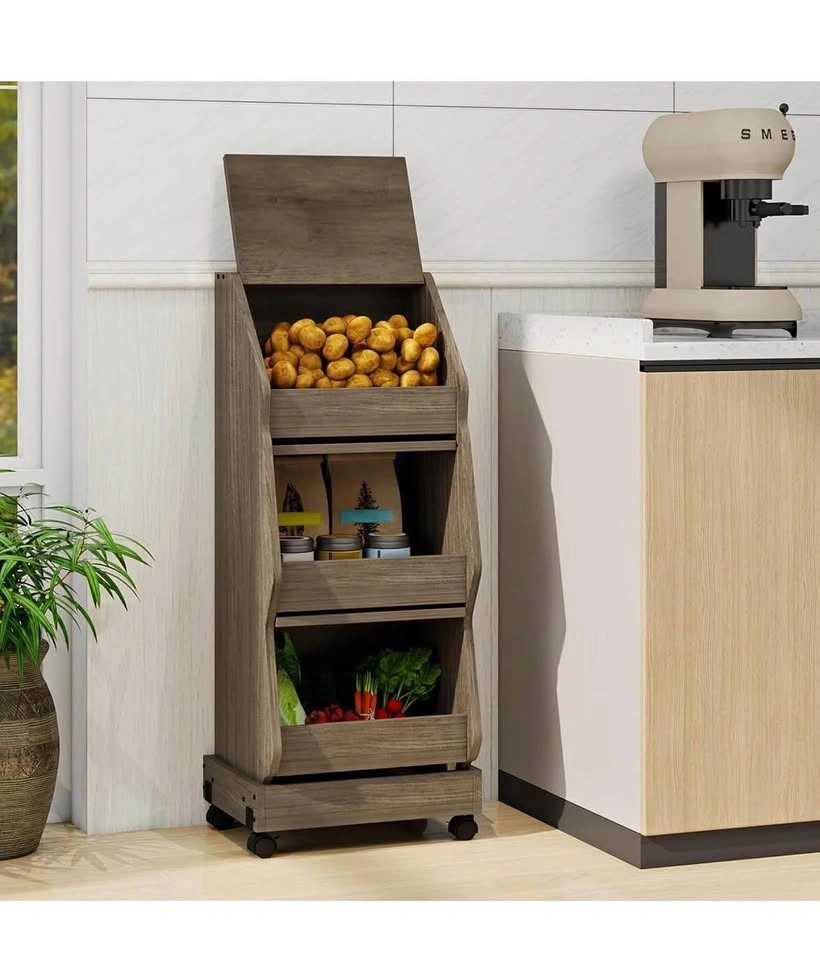 Versatile wood rolling storage cart. Has three tiers for all your kitchen or pantry storage needs. Top compartment has a lid. Middle and bottom compartments have mesh inserts. Moves easily with wheels. Measures about 38 inches tall, 15.7 inches wide, and 13.2 inches deep.