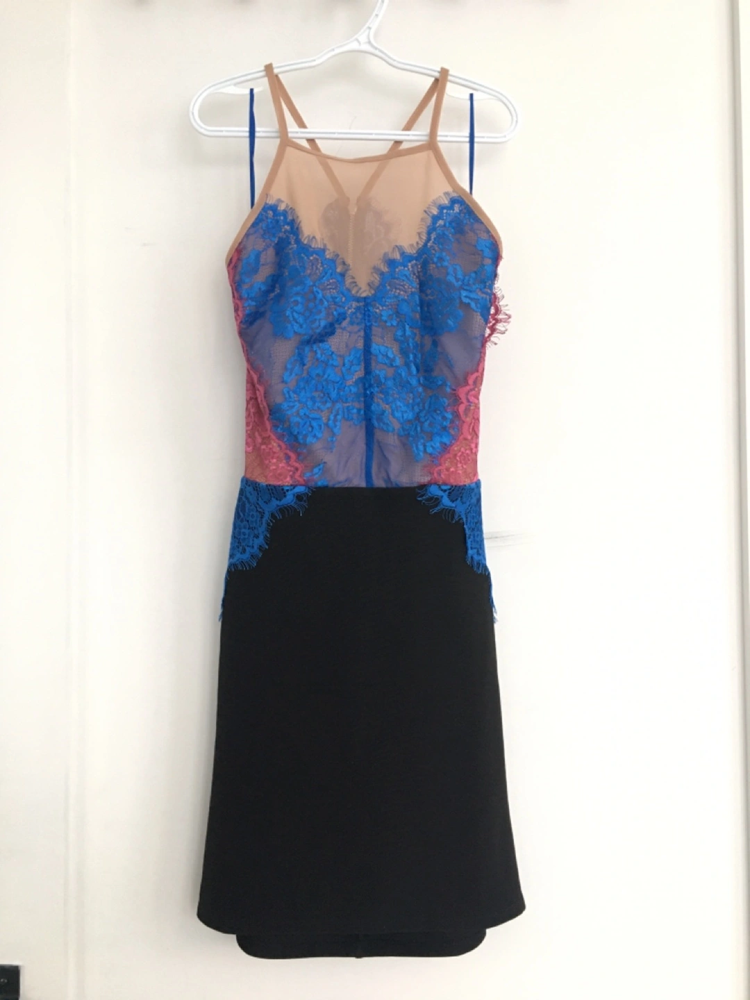This is a TOPSHOP mini dress with intricate blue lace detailing on the bodice. It features a mesh overlay and cut-out details at the waist. The skirt is black.