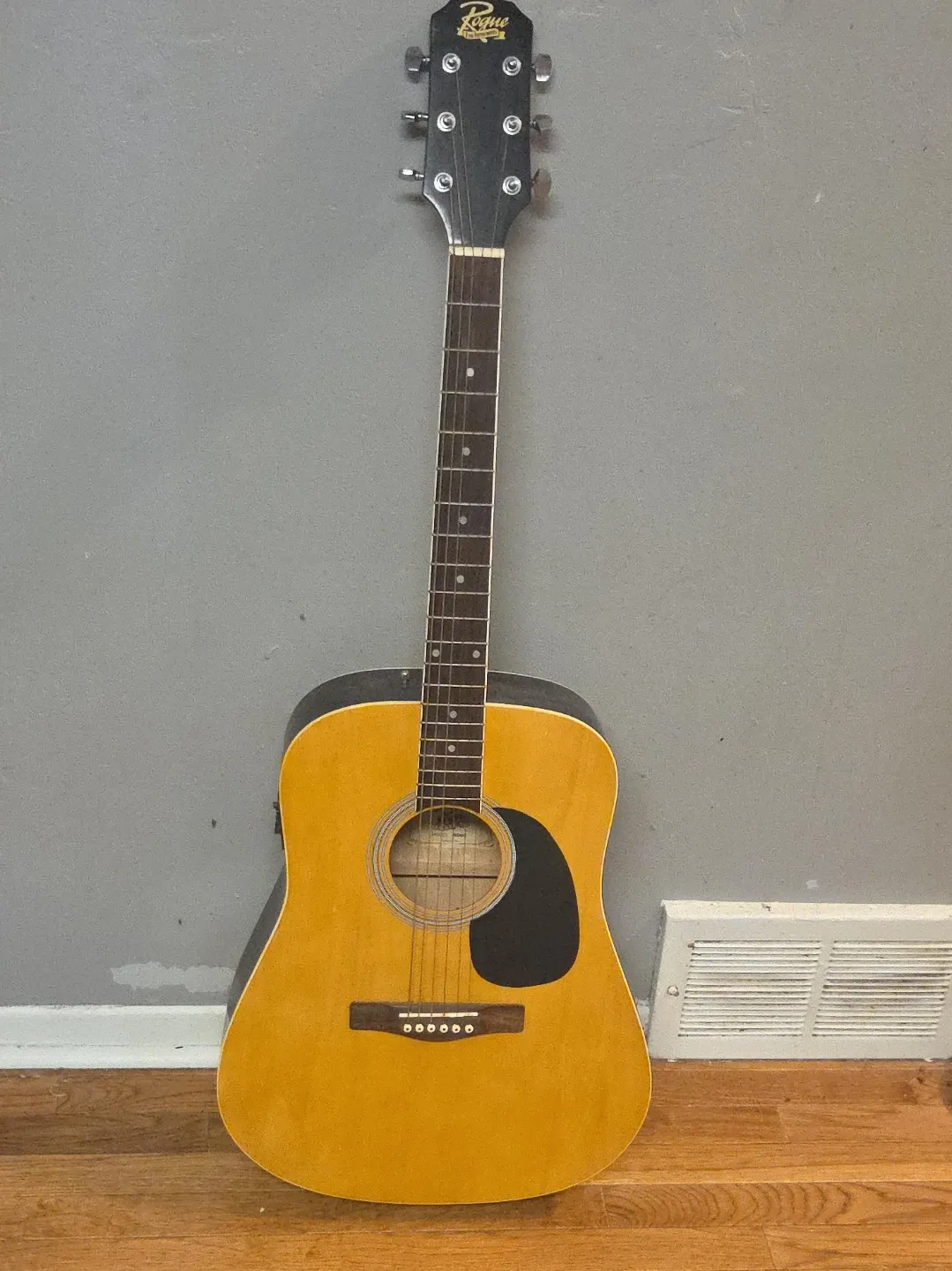 This is a Rogue acoustic guitar. It has a dreadnought body shape and a natural wood finish on the front. The back and sides appear to be black.