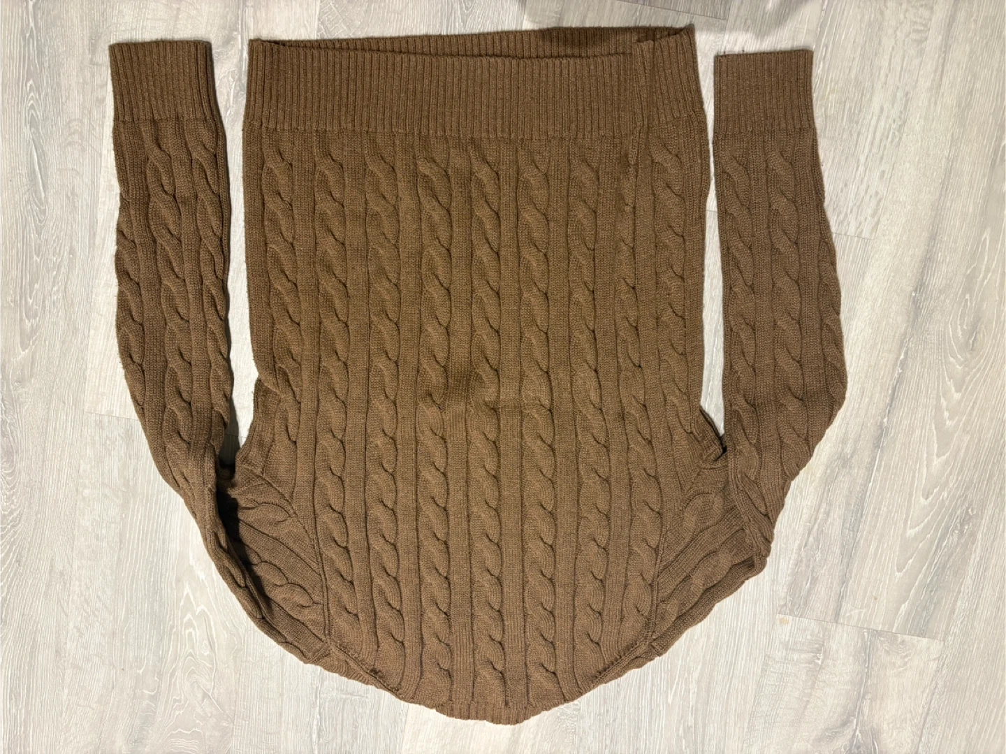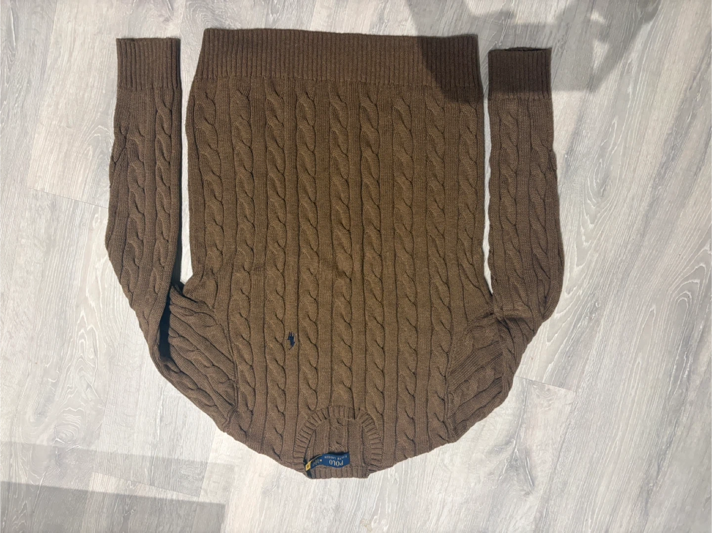 Brown cable knit sweater from Ralph Lauren Polo. It's made from a soft material, perfect for cooler weather. This classic piece features a ribbed collar and cuffs. A timeless addition to any wardrobe!