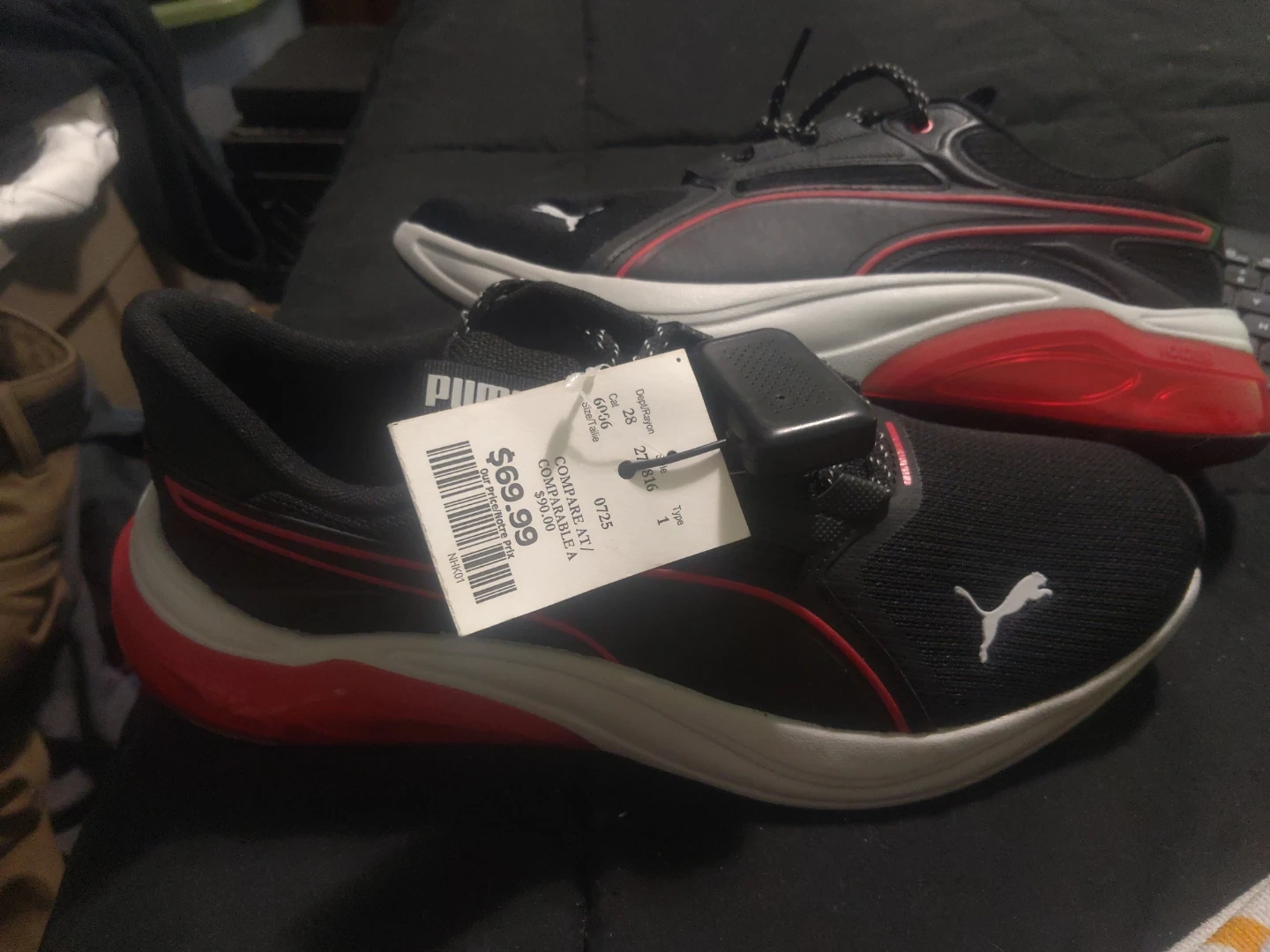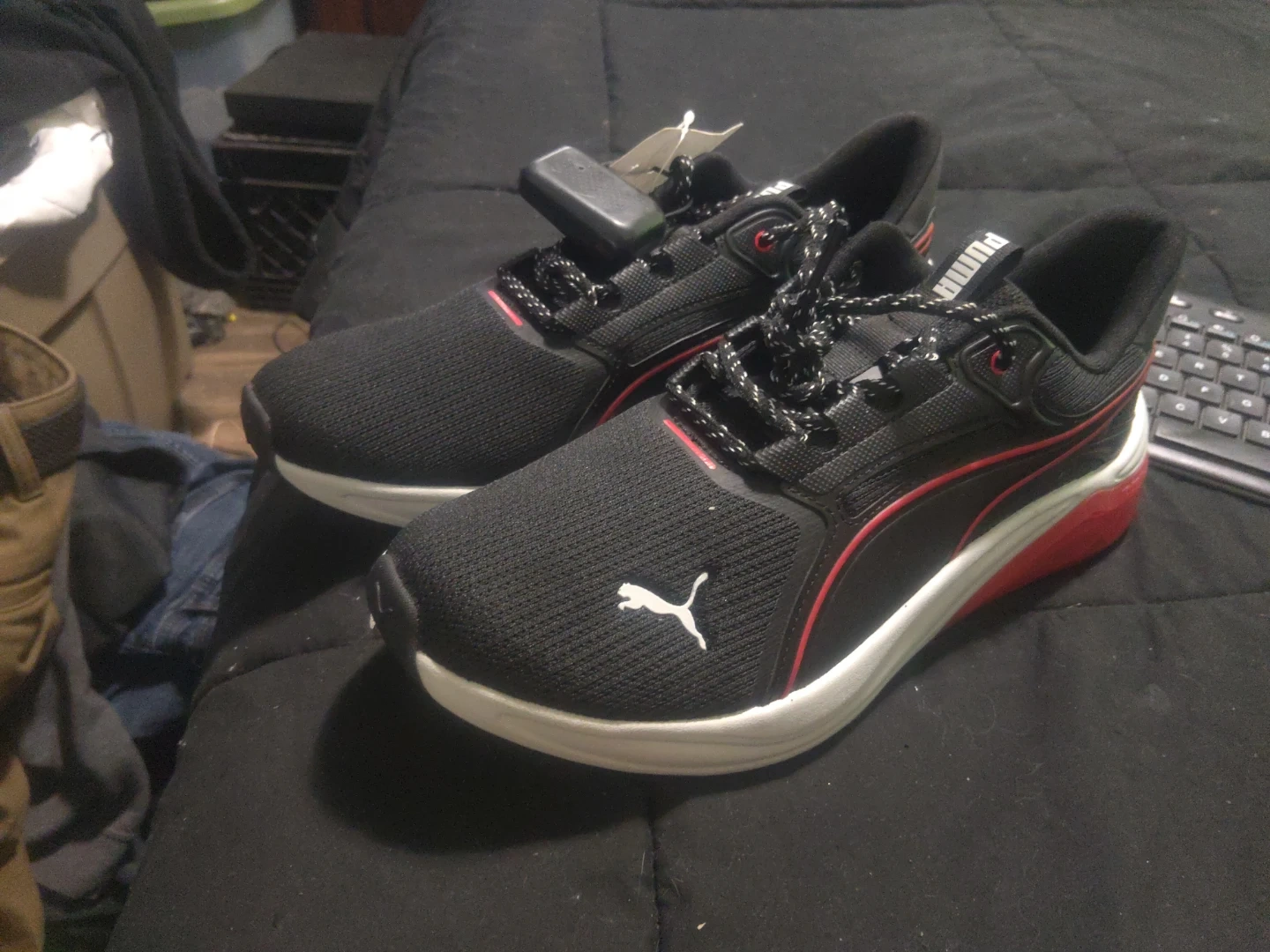 These Puma running shoes are black with red accents. They're designed for comfort and performance. Lightweight construction with a breathable mesh upper.
