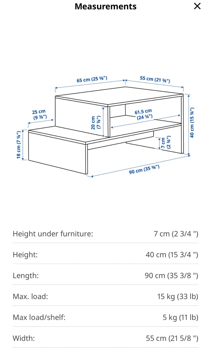 This IKEA HOLMERUD coffee table has an oak effect finish. It's 90 cm long and 55 cm wide. The table offers a good amount of storage space on its shelf. It's a nice addition to a living room!
