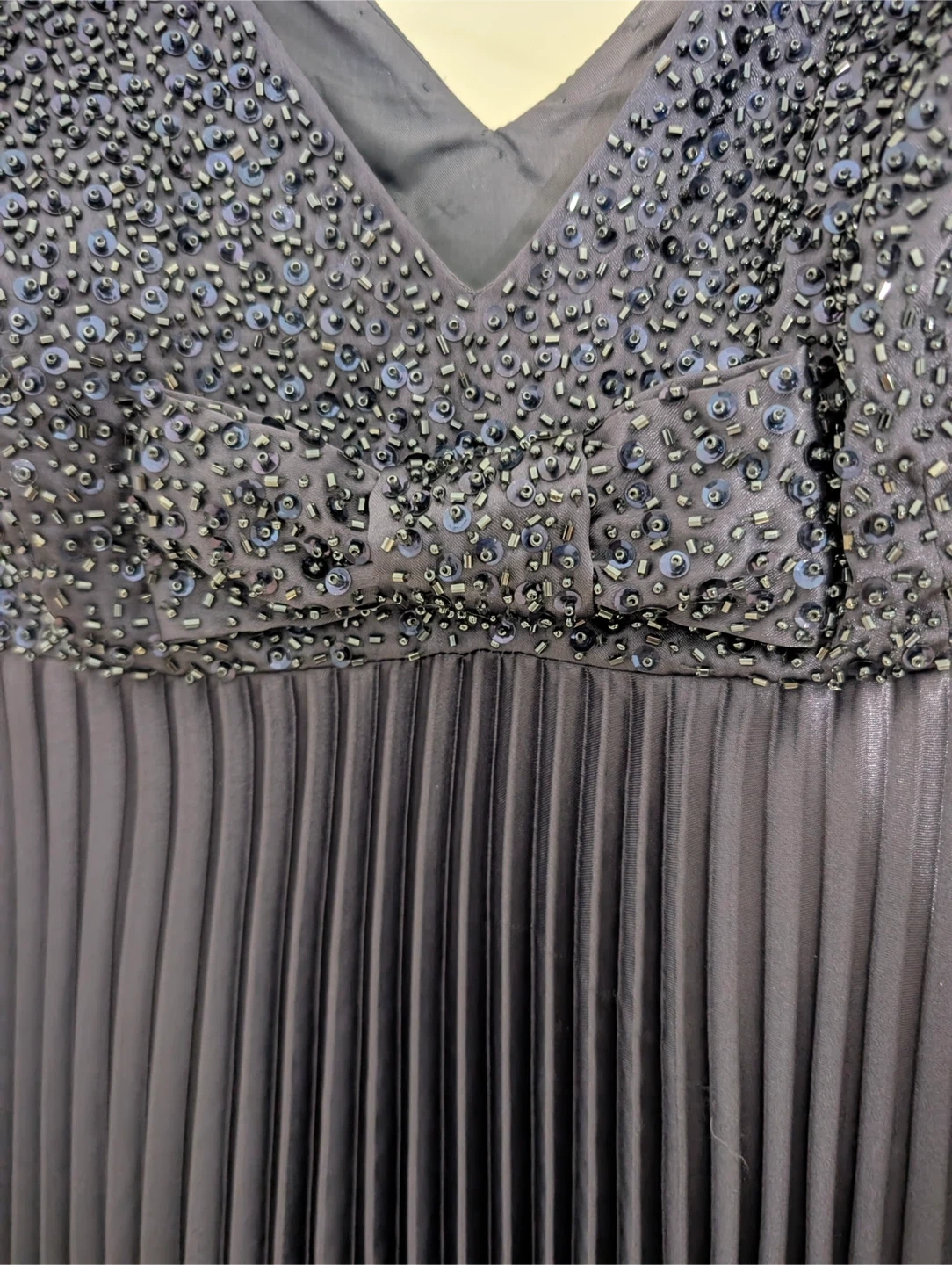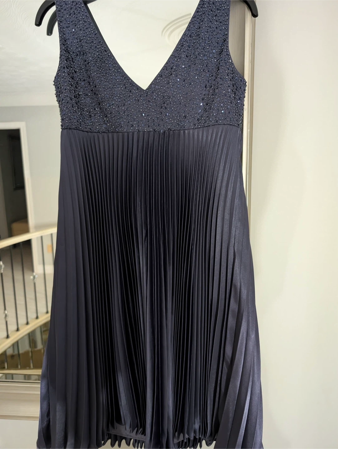 This navy dress features a V-neckline with beaded detailing on the bodice. The skirt is pleated and made of polyester. The lining is acetate. It's a stylish choice for an evening out!