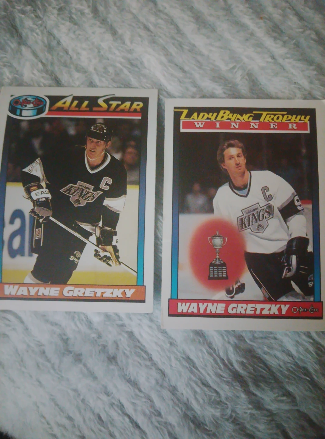 Two O-Pee-Chee Wayne Gretzky hockey cards from 1990-91. One features the All-Star and the other the Lady Byng Trophy winner. These cards are from the 1990-91 season. A great addition for any hockey card collector!
