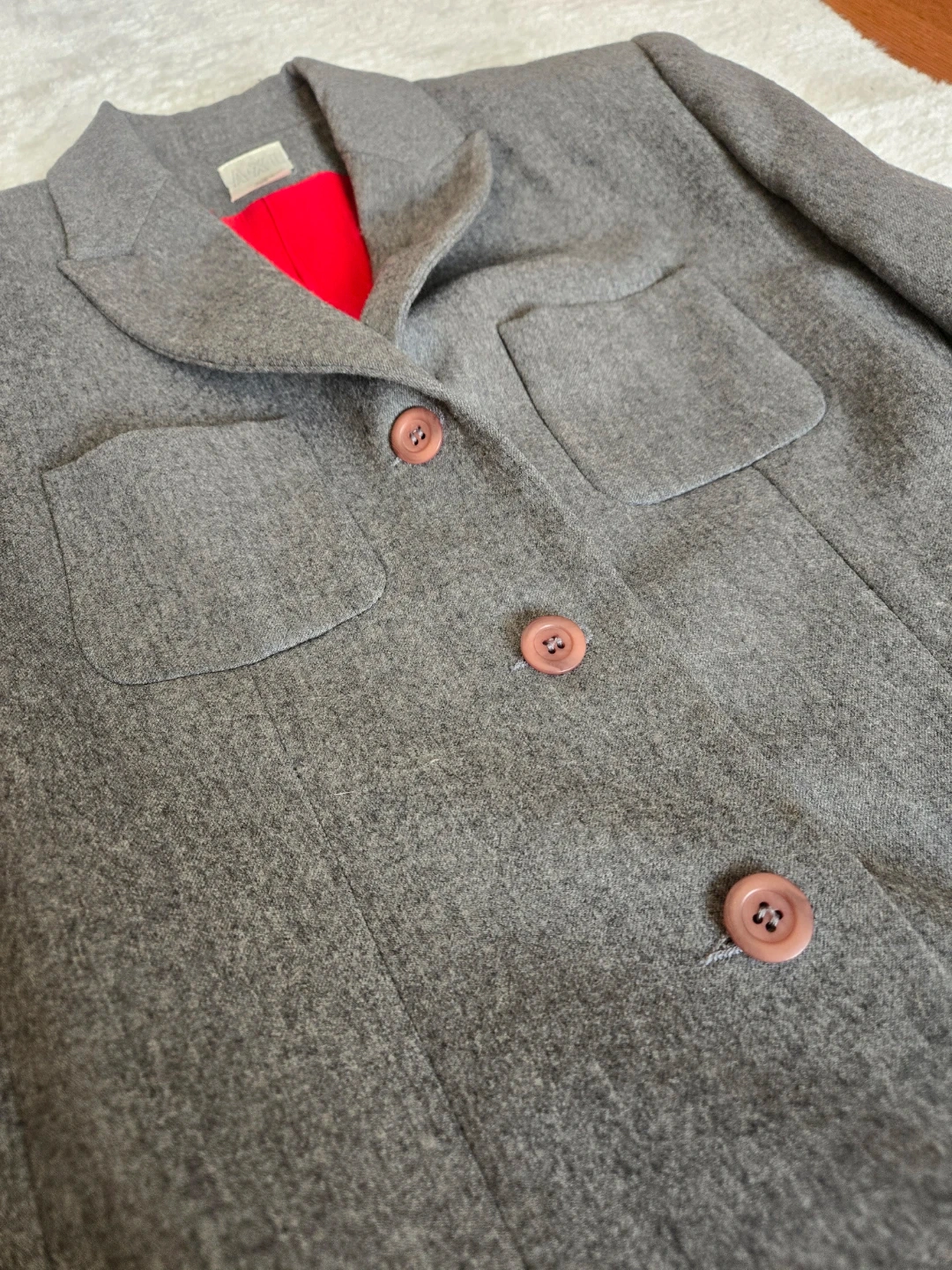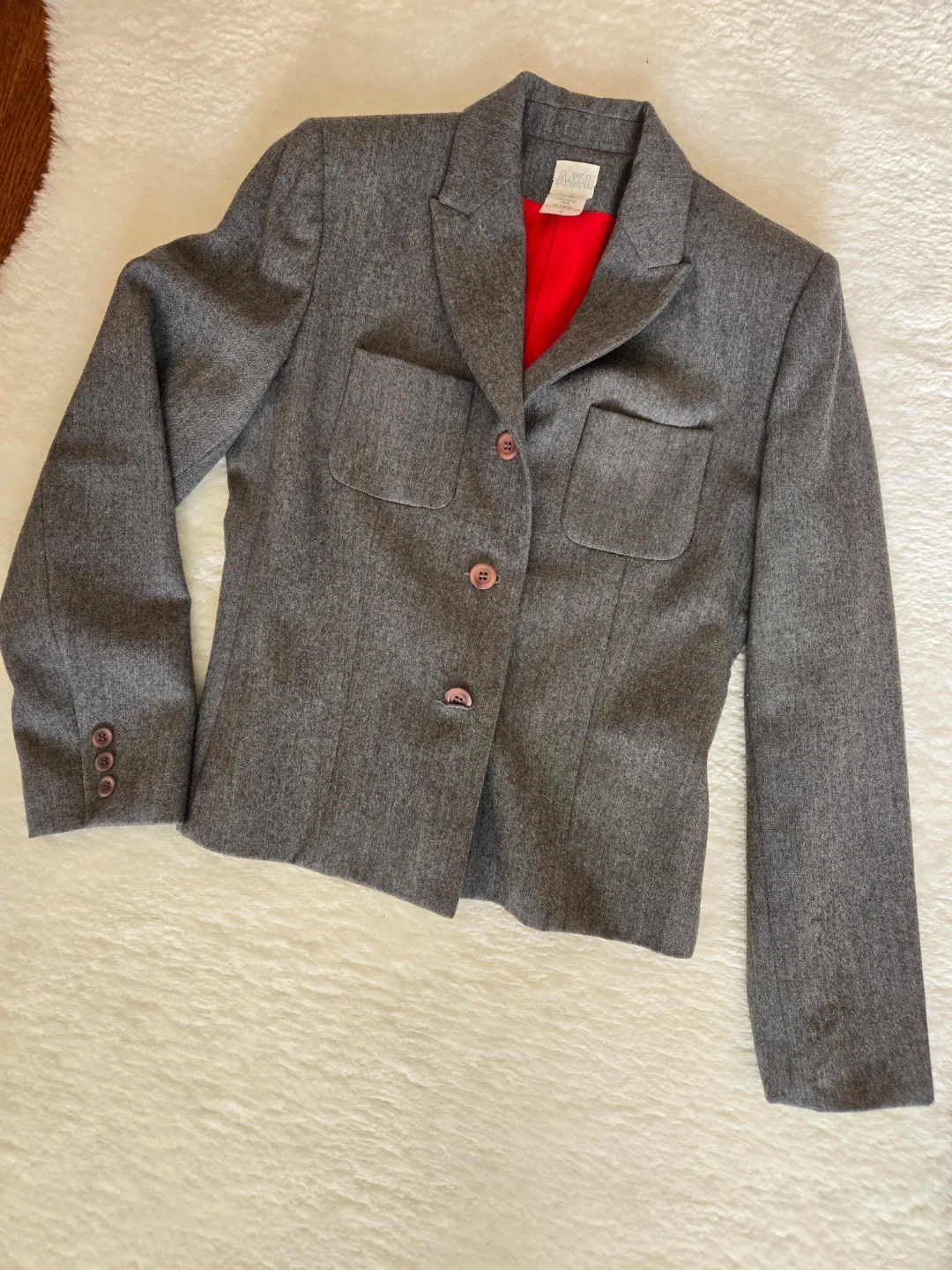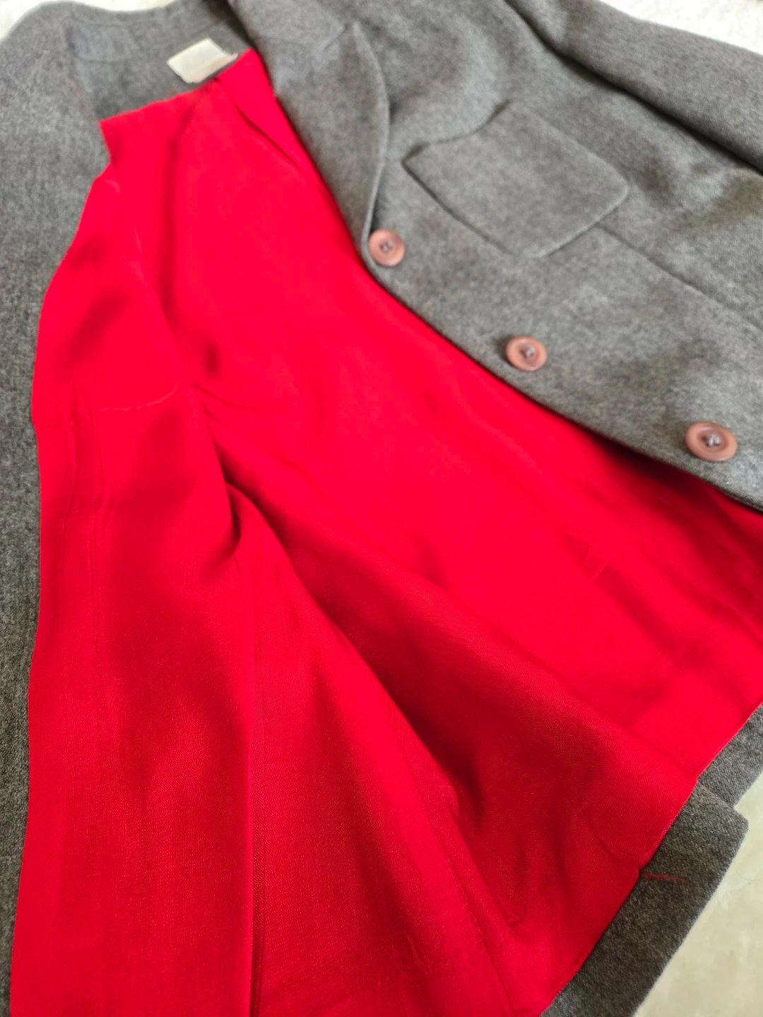 This Gray suit comes in a classic grey tweed with a vibrant red lining. It features front flap pockets and button closures- Pencil long skirt. A stylish addition to any wardrobe!