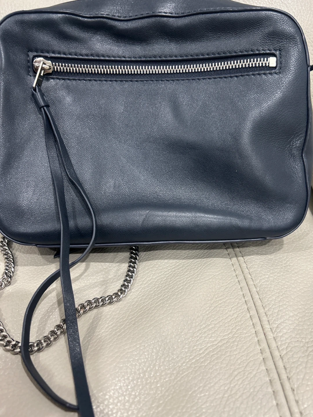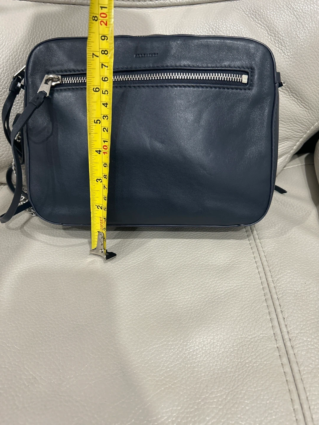 AllSaints crossbody lamb leather bag in a lovely navy blue colour. It's in great shape and ready for a new owner. The bag measures approximately 20cm in length and 15cm in height. Perfect for everyday use!