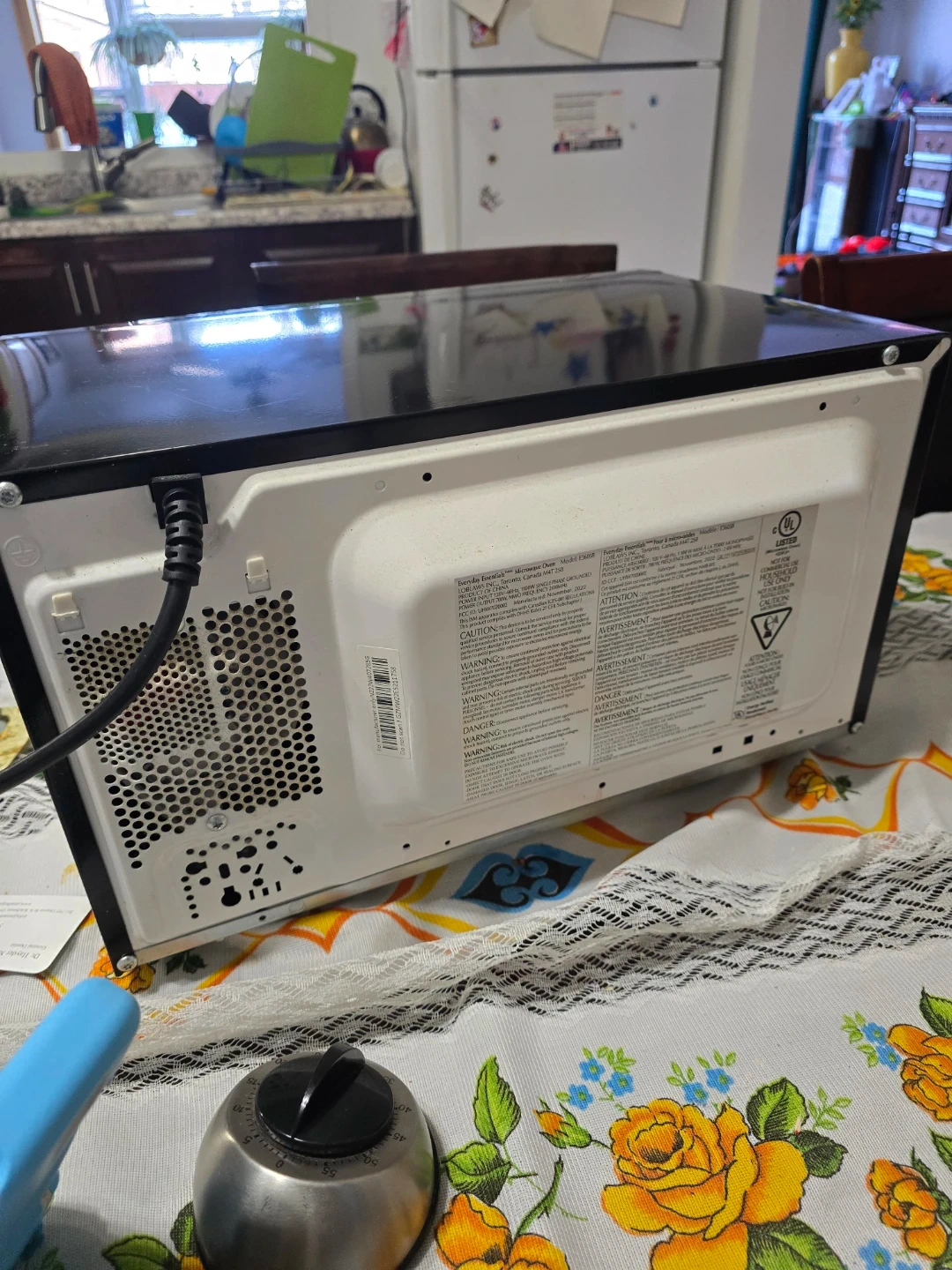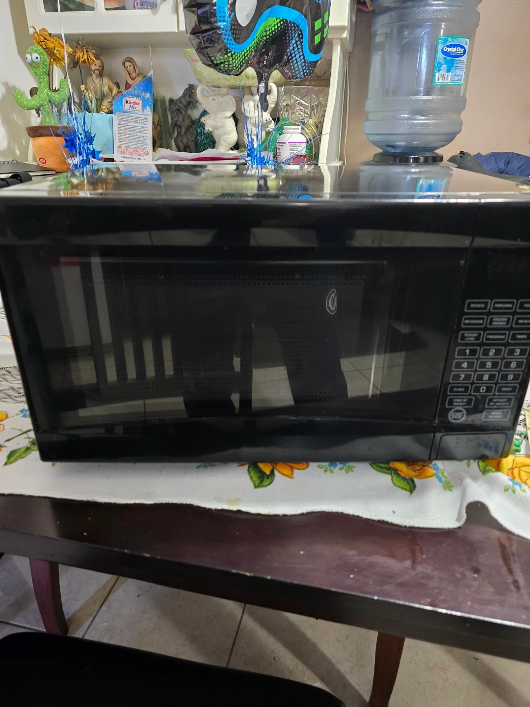 This is a black countertop microwave. It has a glass turntable inside. Perfect for reheating meals or quick snacks!