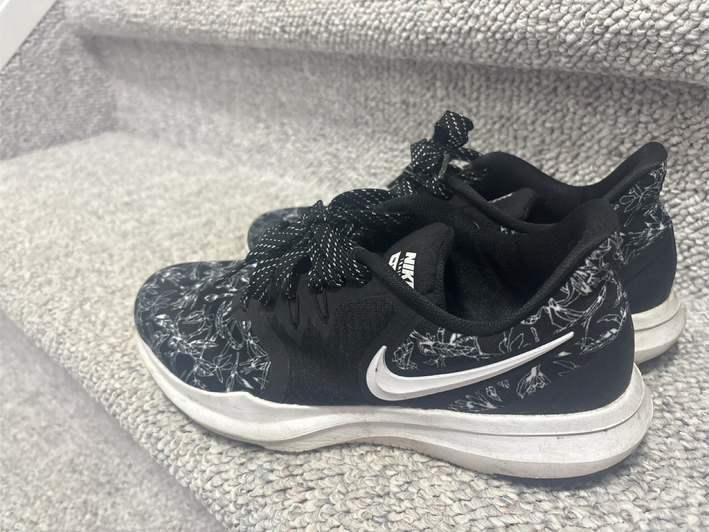 These Nike running shoes are black with a white floral pattern. They feature a lace-up closure and a cushioned sole. Size is 7.5. Pick up cash only