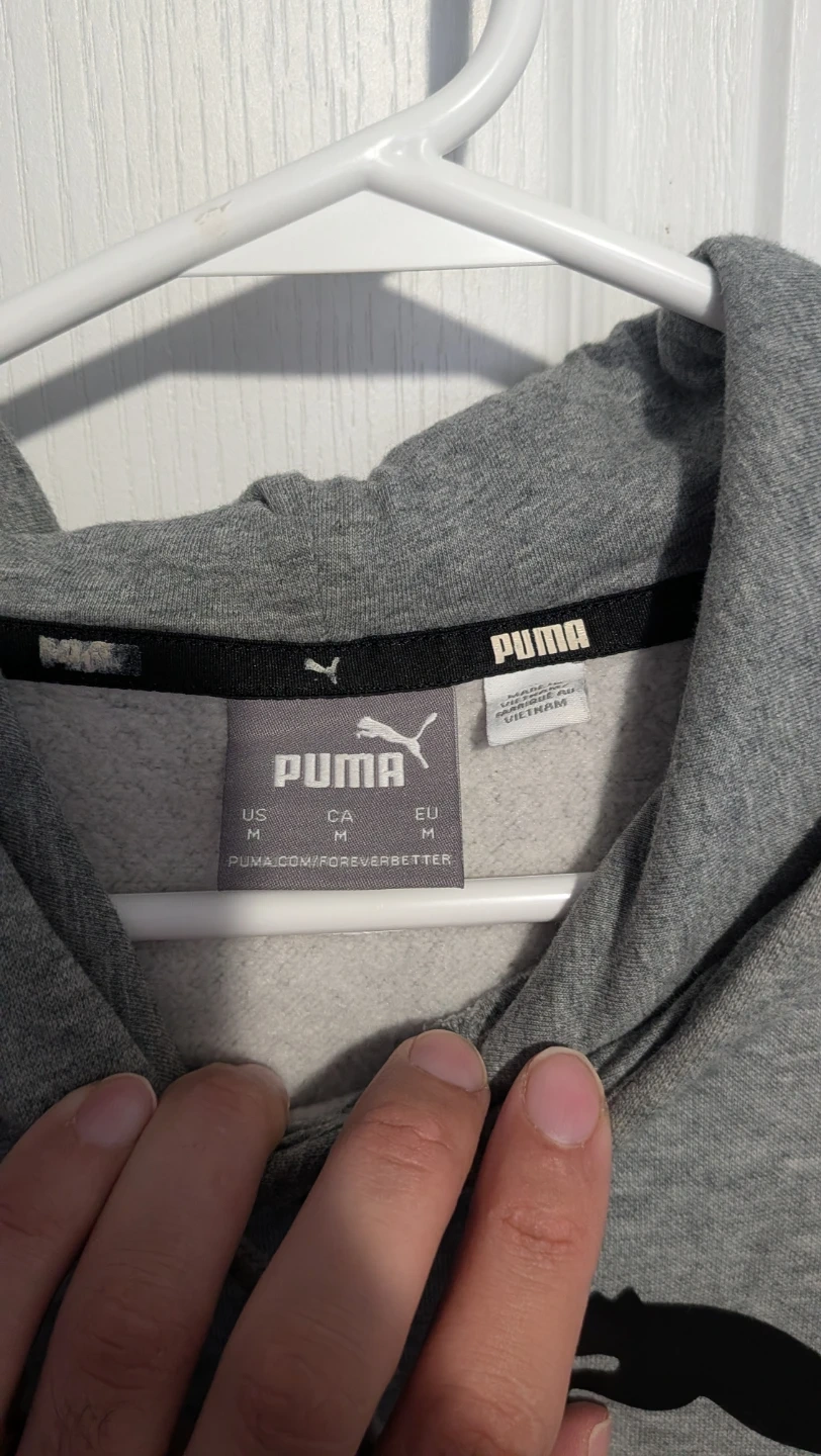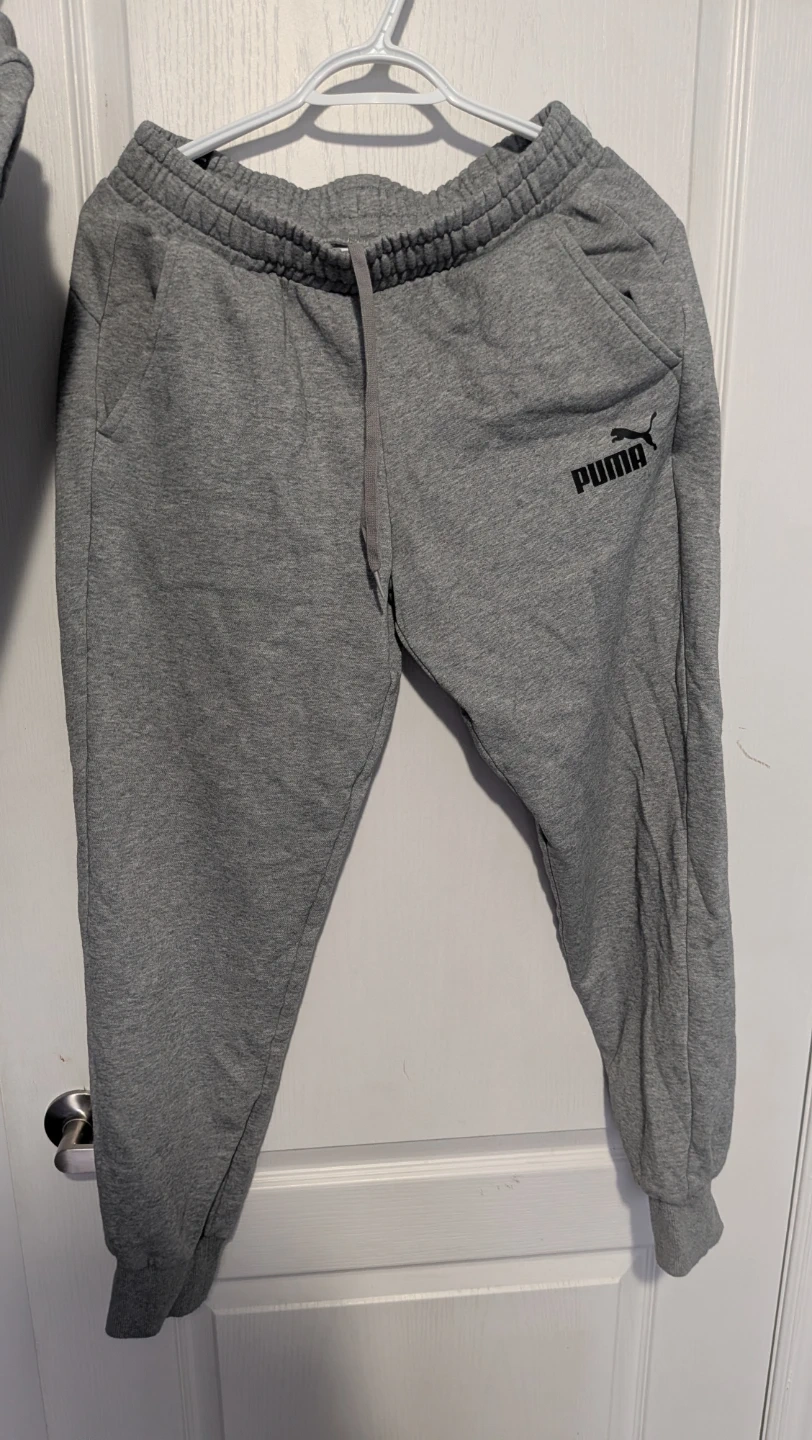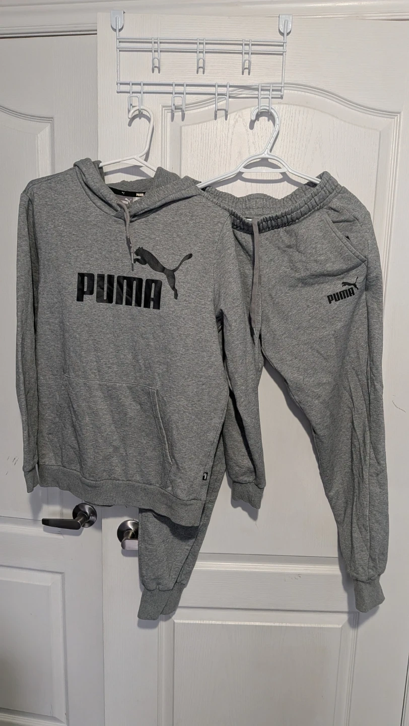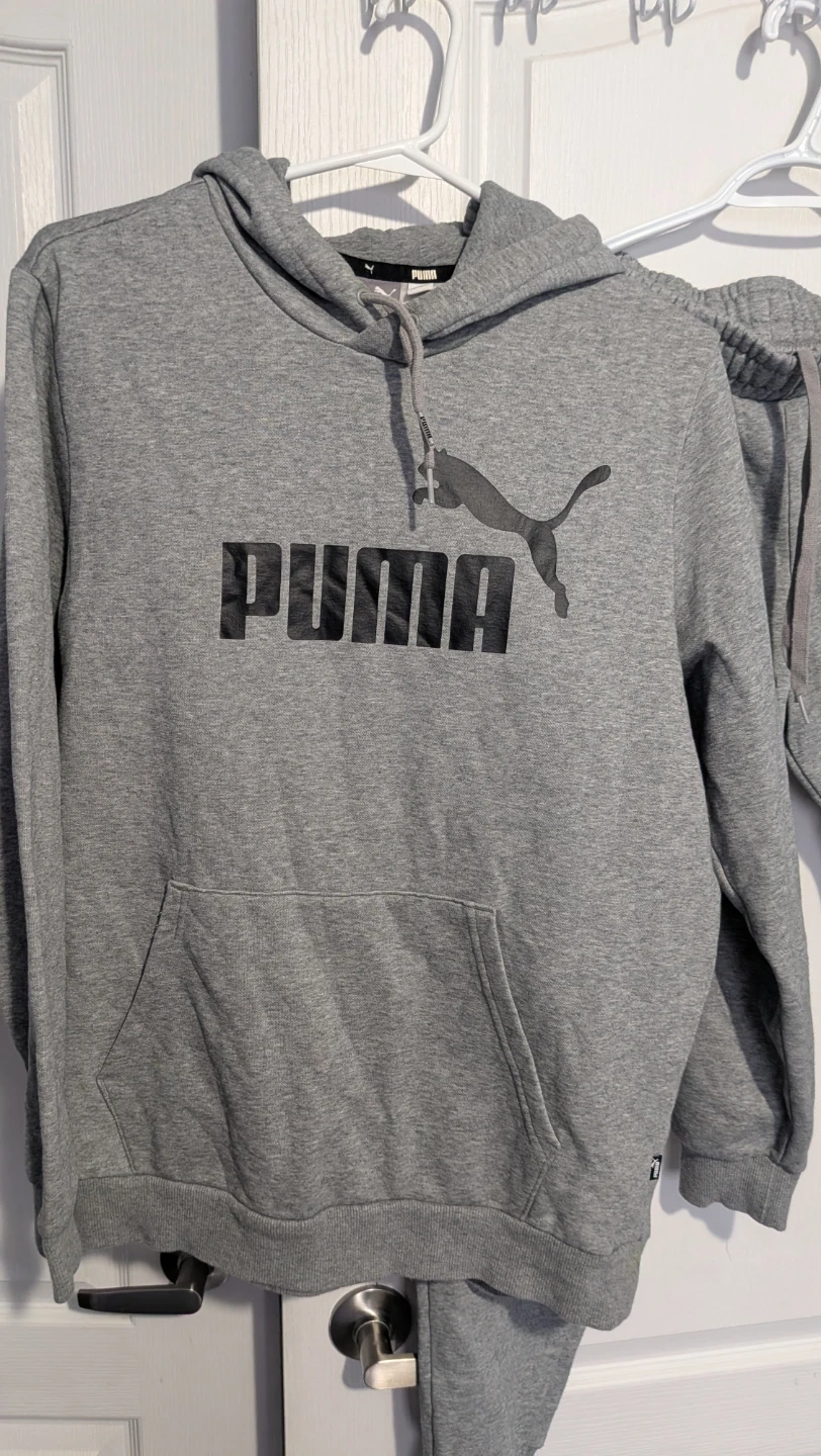 This is a grey Puma hoodie and sweatpants set, size medium. It fits closer to a small. The set is worn but clean.