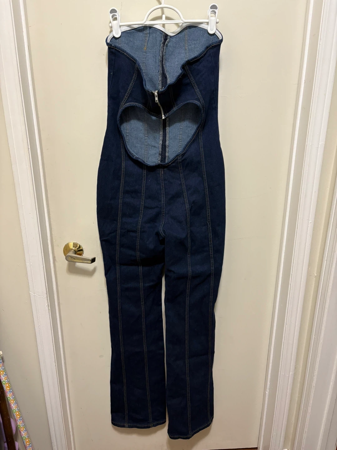 This strapless jumpsuit is made from cotton in a dark wash denim. It features a zip closure at the back and a cutout detail. This piece is comfortable and stylish. Size small. I'm usually a medium but it fits comfy just too big in the top. Bought for $50+shipping.