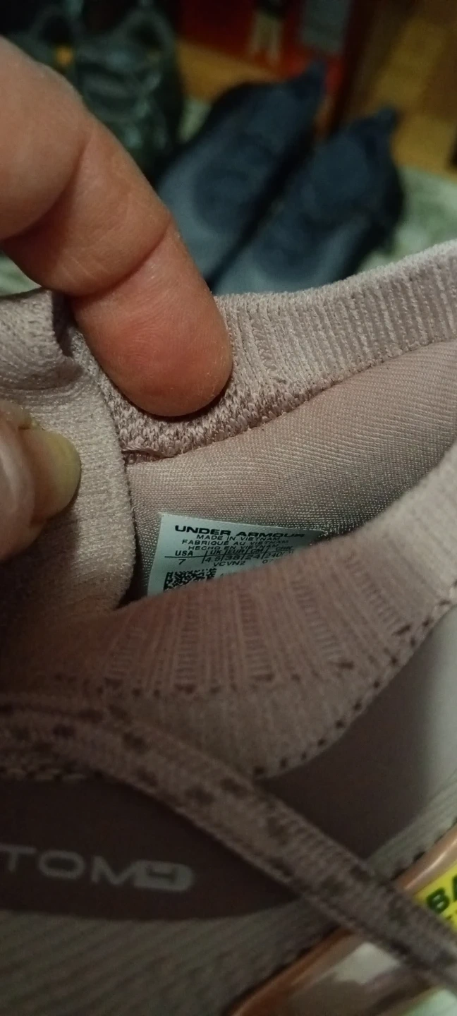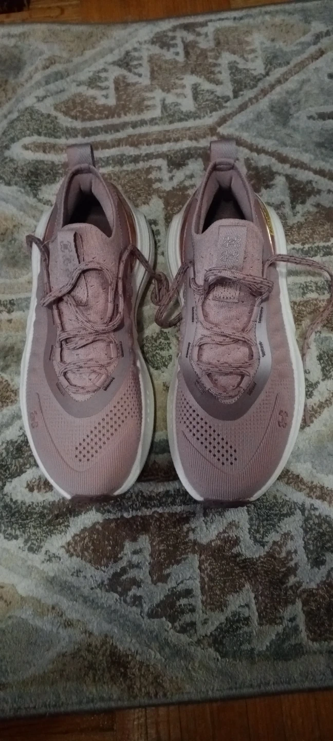 These Under Armour running shoes size 7 are a dusty rose colour. They feature a breathable mesh upper and a cushioned sole for comfort. Great for hitting the gym or going for a jog!