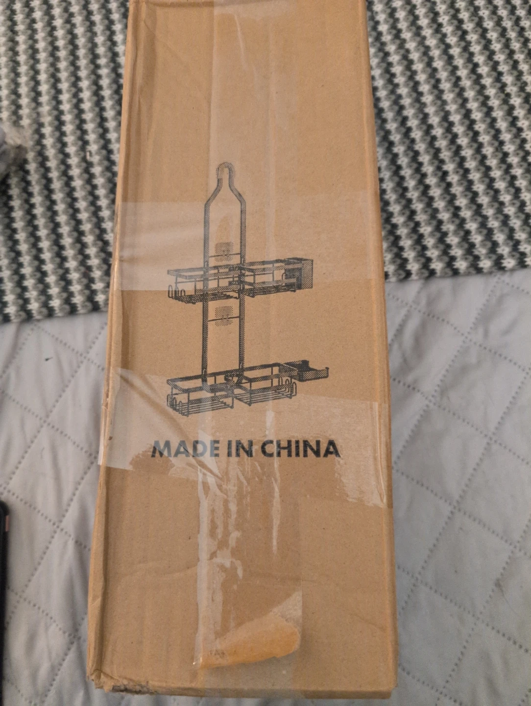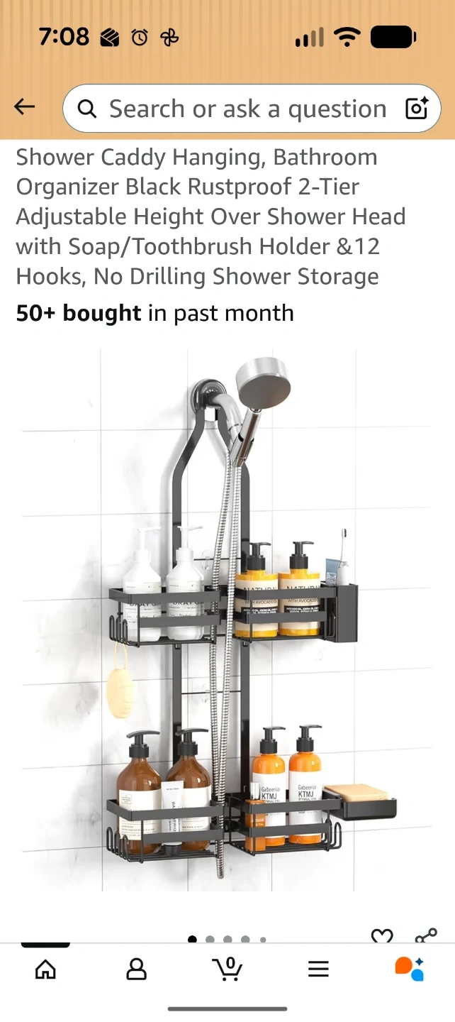 This is a shower caddy organizer. It's made of rustproof black metal and has two tiers with drainage holes. It's designed for bathroom organization. Hangs over the showerhead. Amazon sells new for 35.99