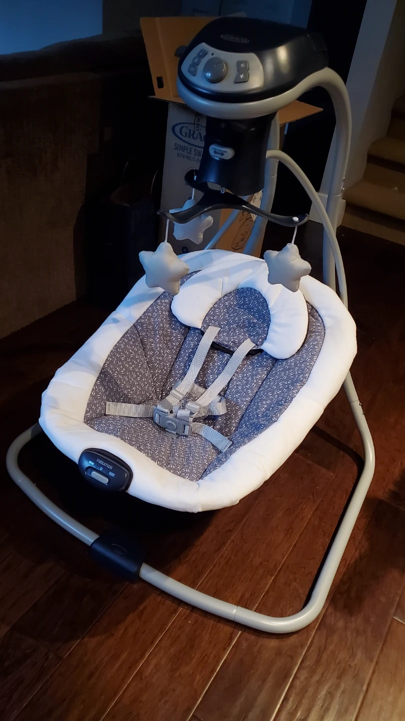 This is a Graco baby swing with a comfortable padded seat. It features a vibrating seat for soothing your baby. Includes a mobile with stars. Perfect for keeping your little one entertained and calm!