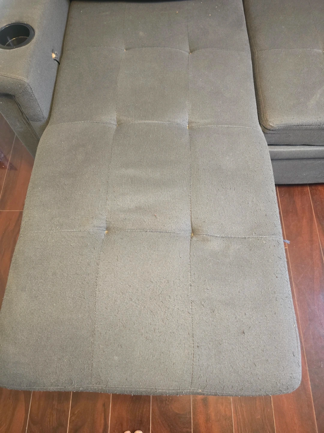 Moving Sale Grey fabric sectional sofa with a chaise lounge. It features tufted cushions and built-in storage. Cup holders are integrated into the arms. Perfect for small spaces needing extra seating and storage!