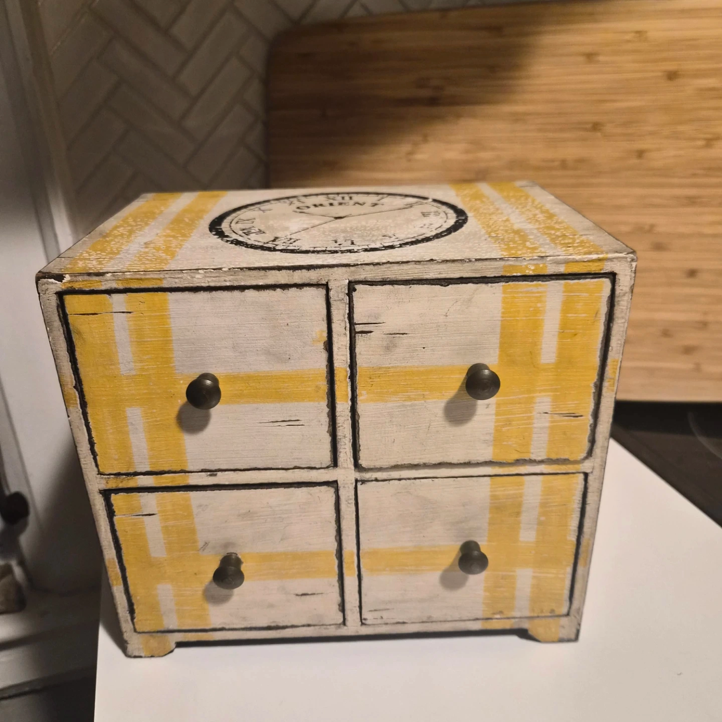 This eclectic tabletop organizer features a distressed white finish with yellow striped accents and a vintage clock face design. It has four small drawers, each with a burnished brass knob, perfect for storing small items. It's a great addition for keeping trinkets or desk supplies tidy!