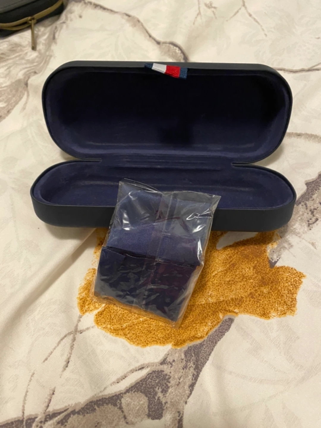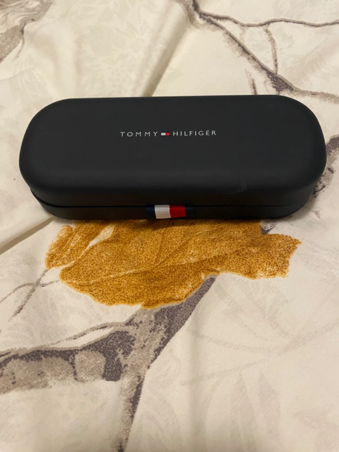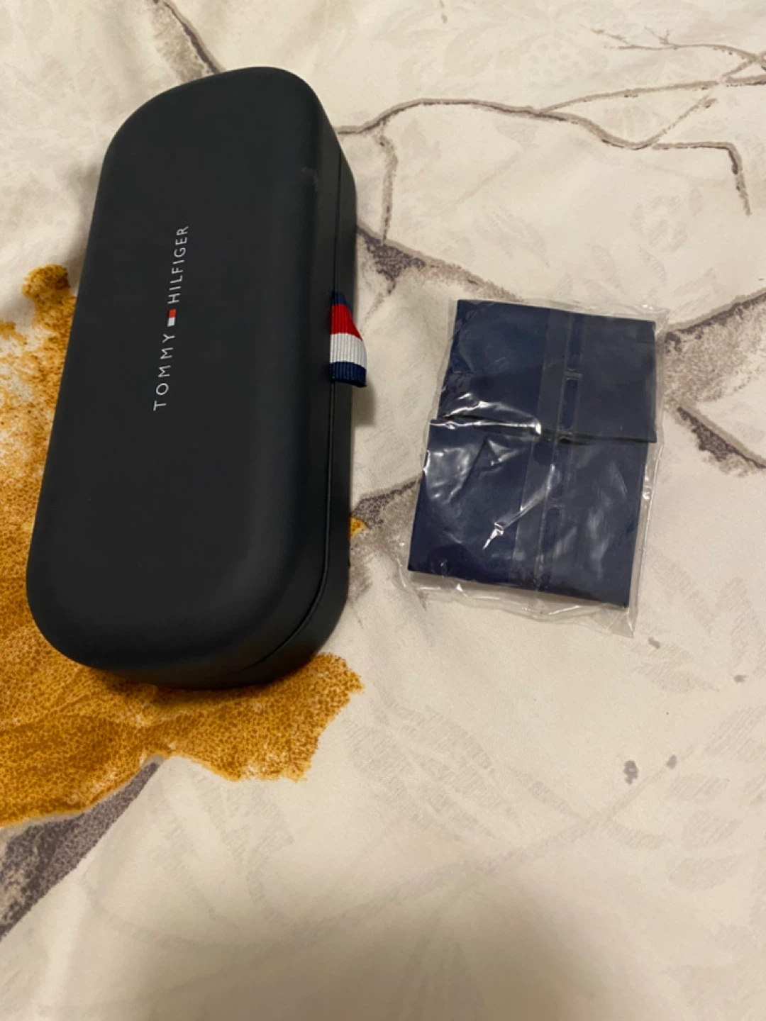 This is a Tommy Hilfiger hard shell case for glasses. It's black with the Tommy Hilfiger logo. The case comes with a soft cleaning cloth inside, also in a protective plastic bag. Protects your eyewear in style!