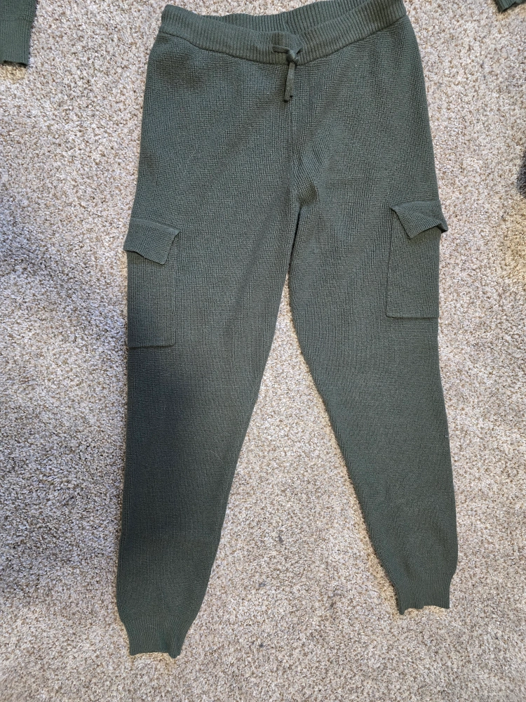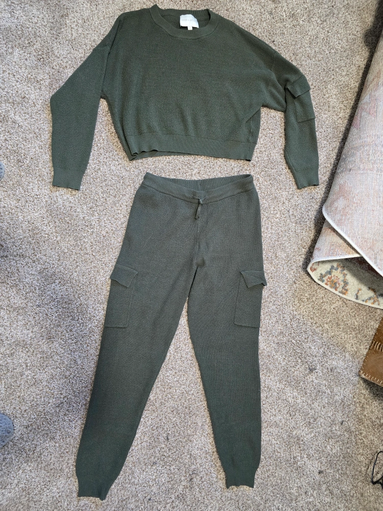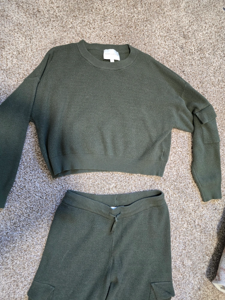 Size large green knit sweat suit. Side pockets, top is cropped. Very stretchy.