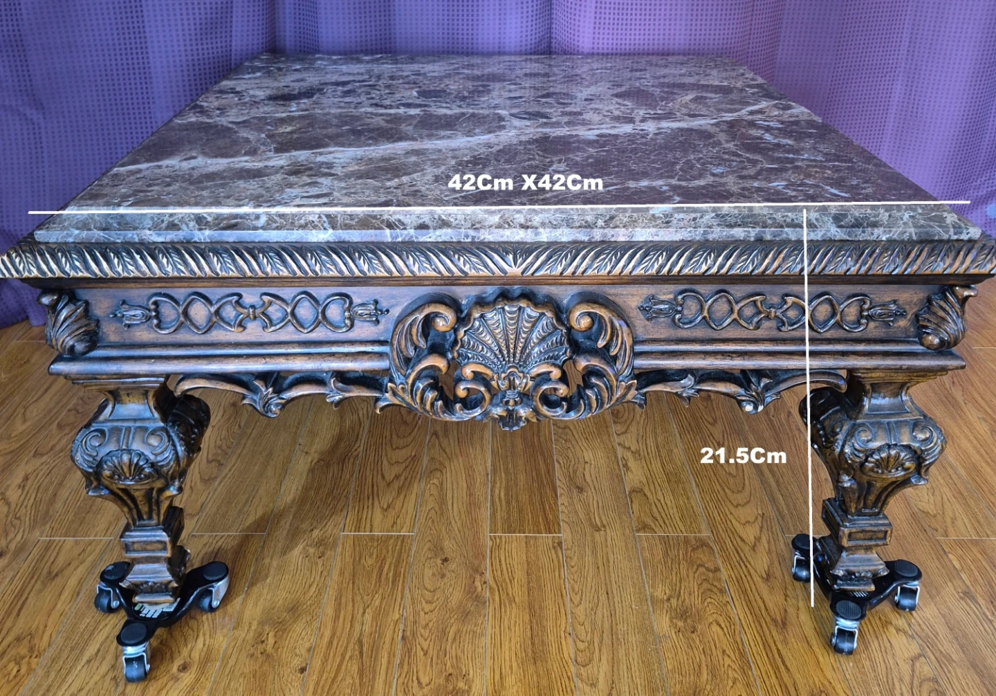 A Square coffee table featuring a marble-look top and highly detailed, ornate base. Its dimensions are 42cm by 42cm, with a height of 21.5cm. Good condition
