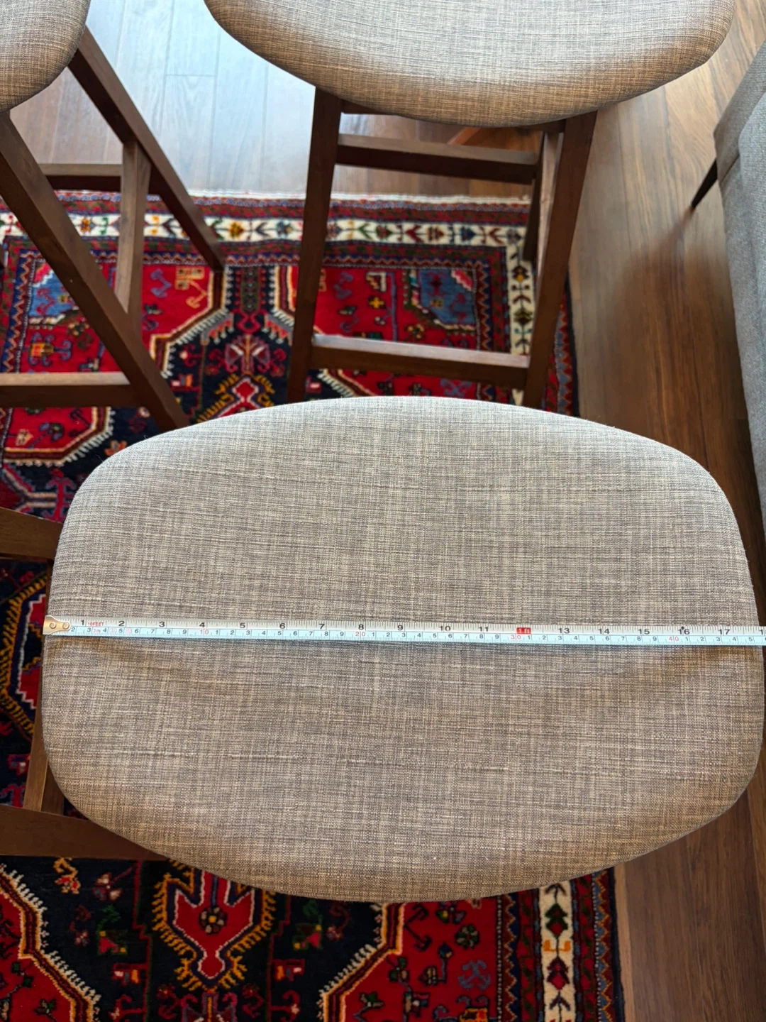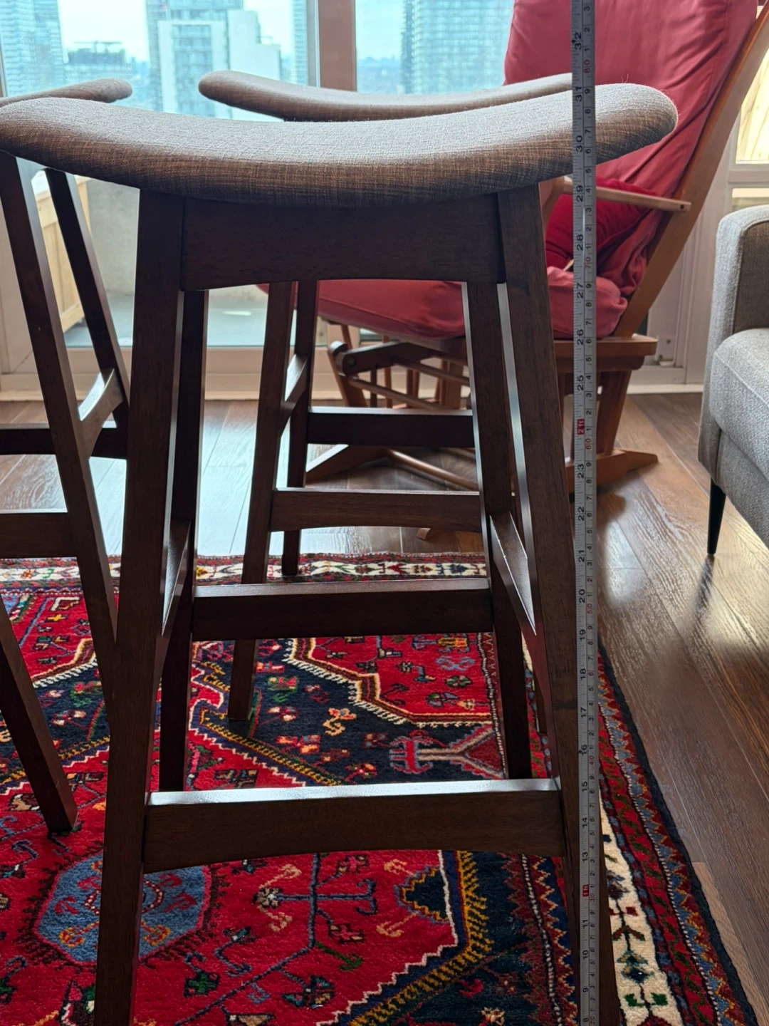 Four comfortable bar stools with grey fabric upholstered seats and dark wooden frames. Seat width is approximately 17 inches. These stools are great for a kitchen island or home bar setup.