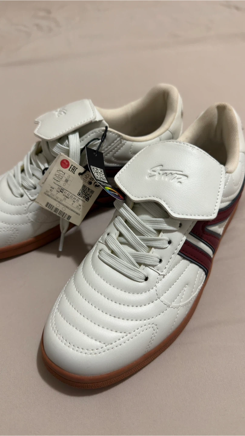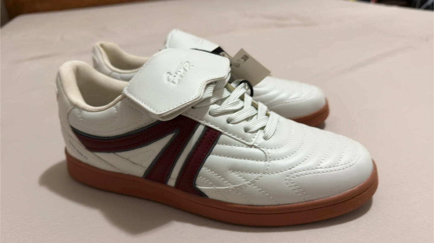 White Stylo soccer cleats with maroon stripe accents and a brown sole. Lace-up closure with an additional velcro strap for a secure fit. Perfect for indoor soccer or turf play!