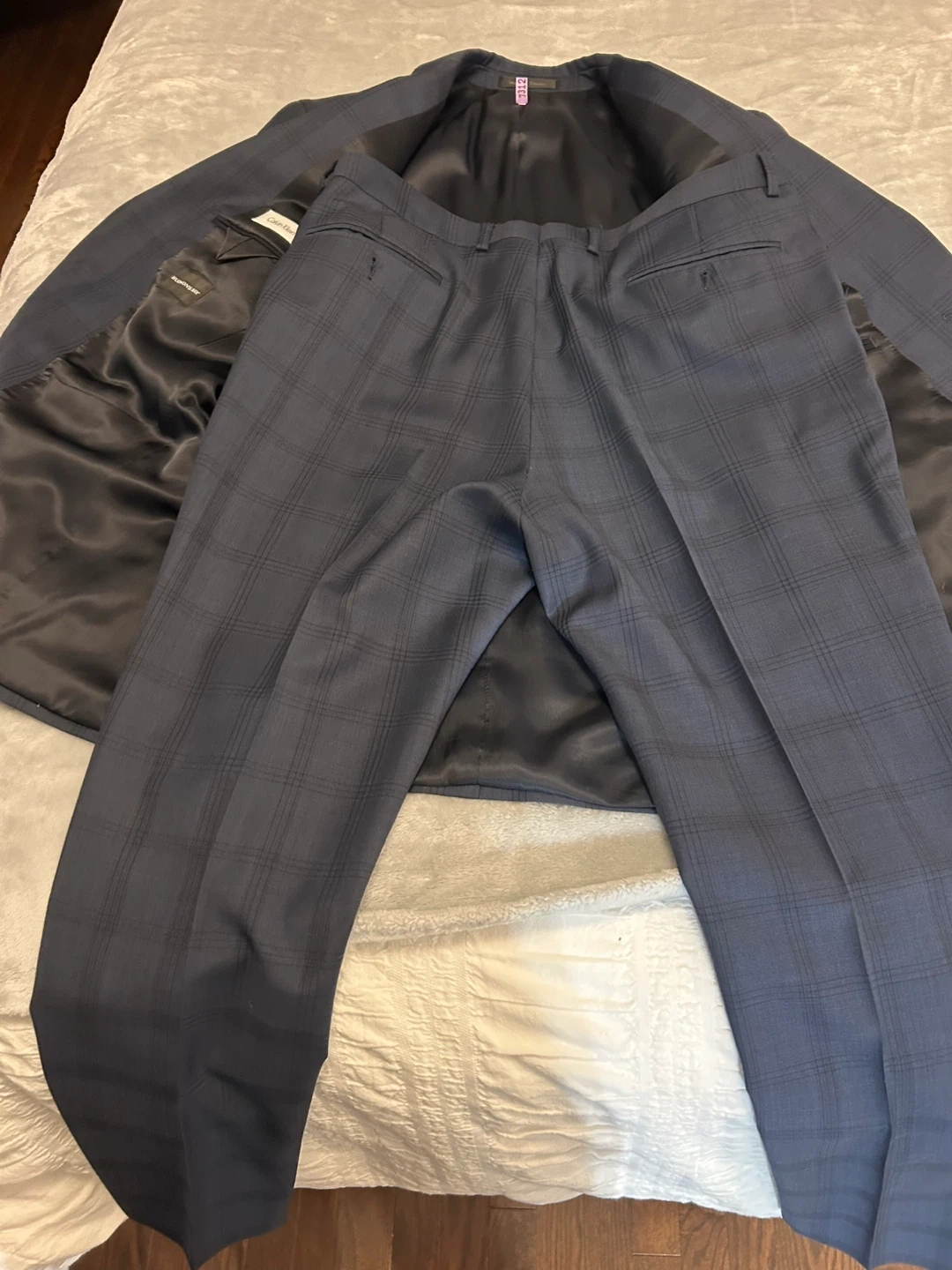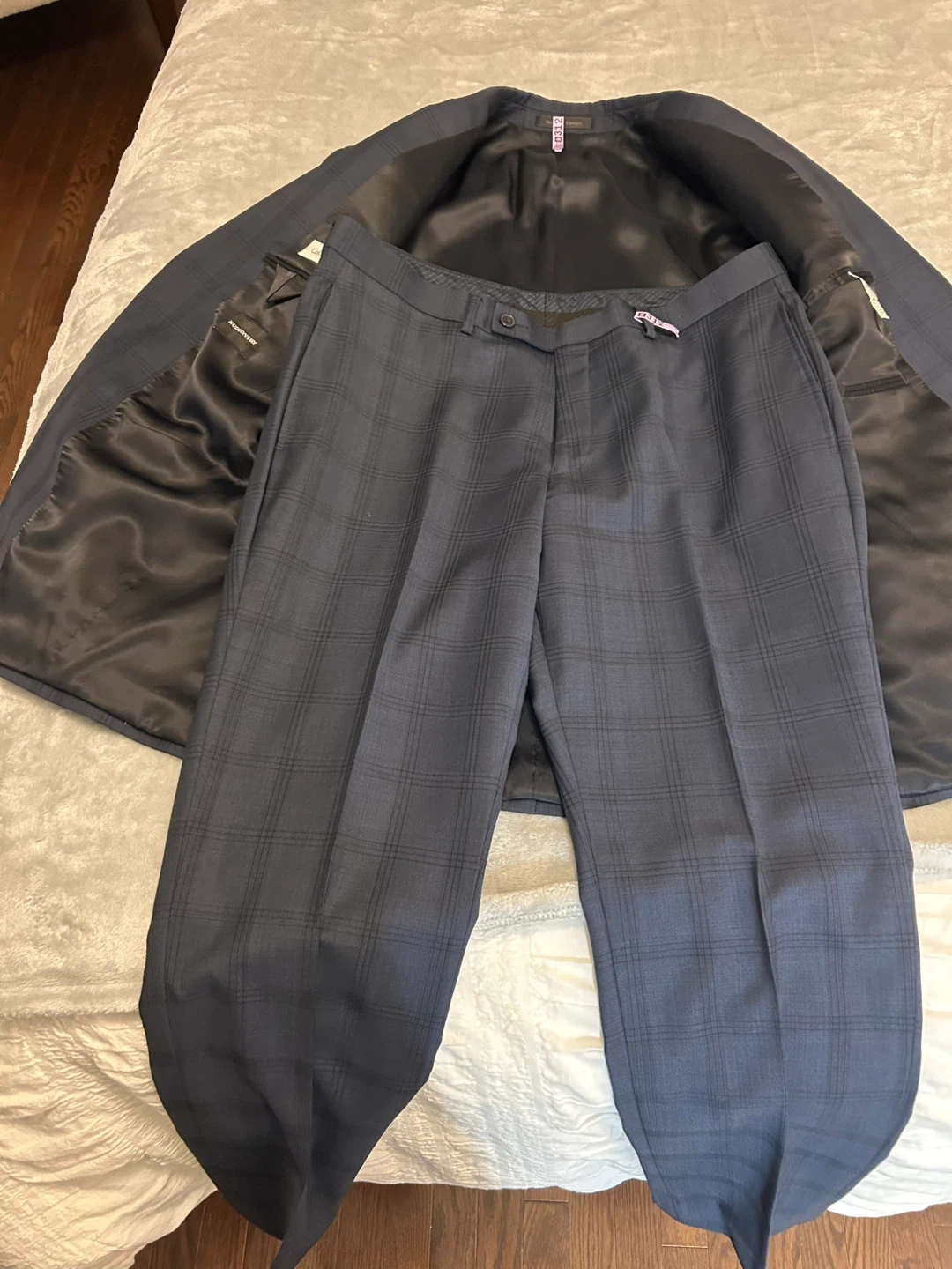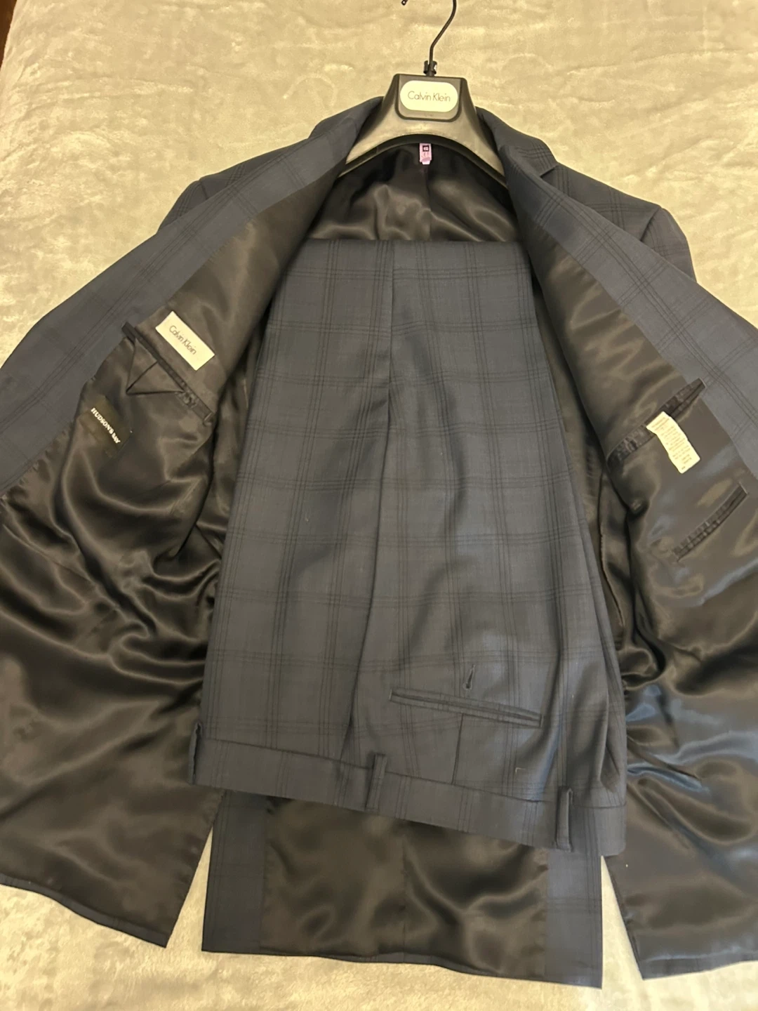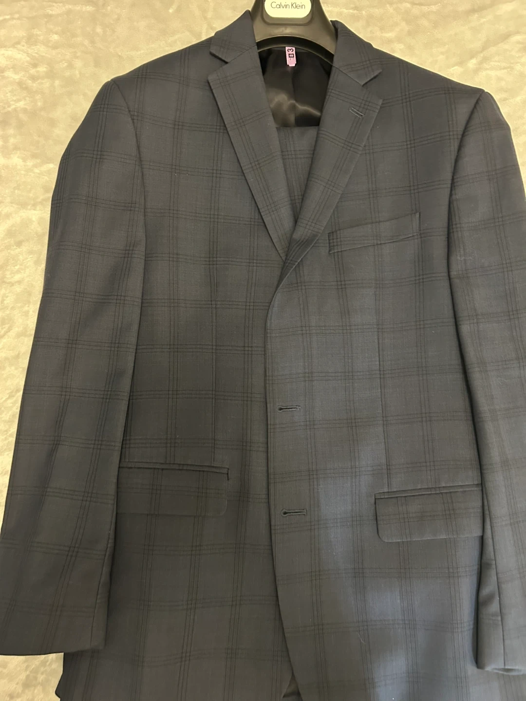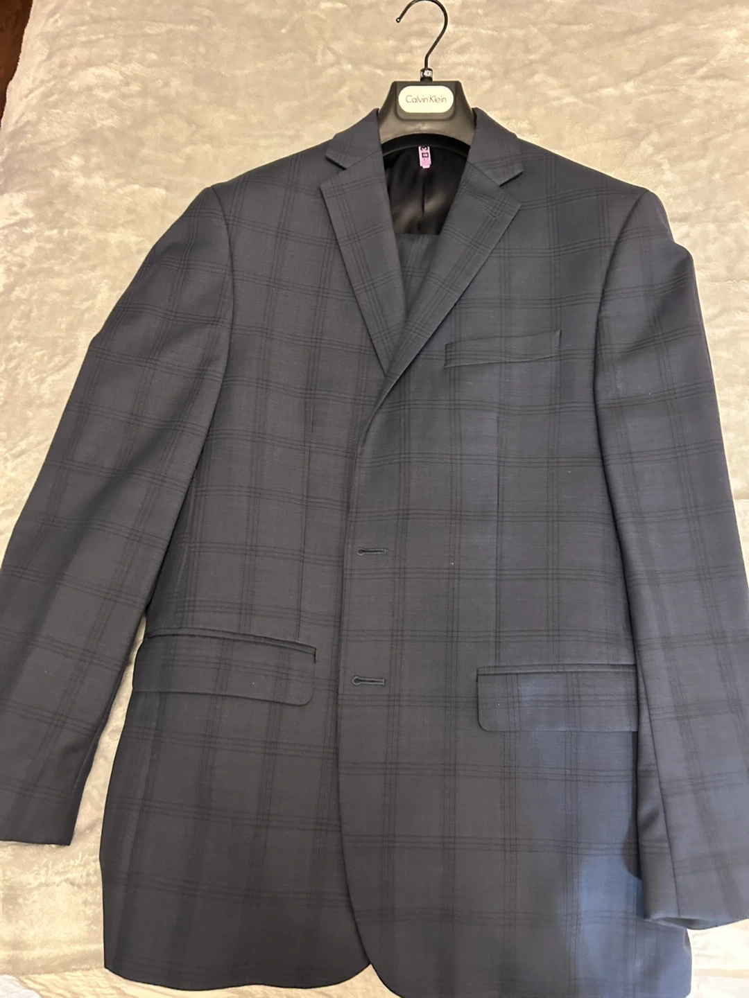 This is a Calvin Klein men's suit. It's a 40R size and features a subtle plaid pattern. The suit is made of 100% wool. It's suitable for formal occasions or professional wear. In excellent condition!