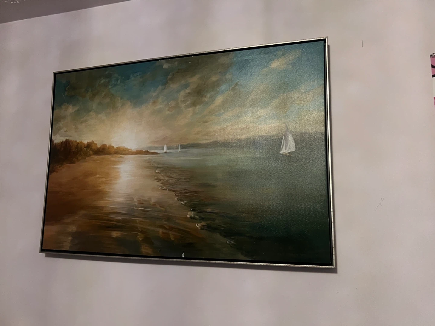 This framed painting depicts a serene seascape with sailboats on the water. It features a beach and trees on the left, with a sunset or sunrise in the background. The frame is a neutral silver tone. It's ready to hang and would complement any room.