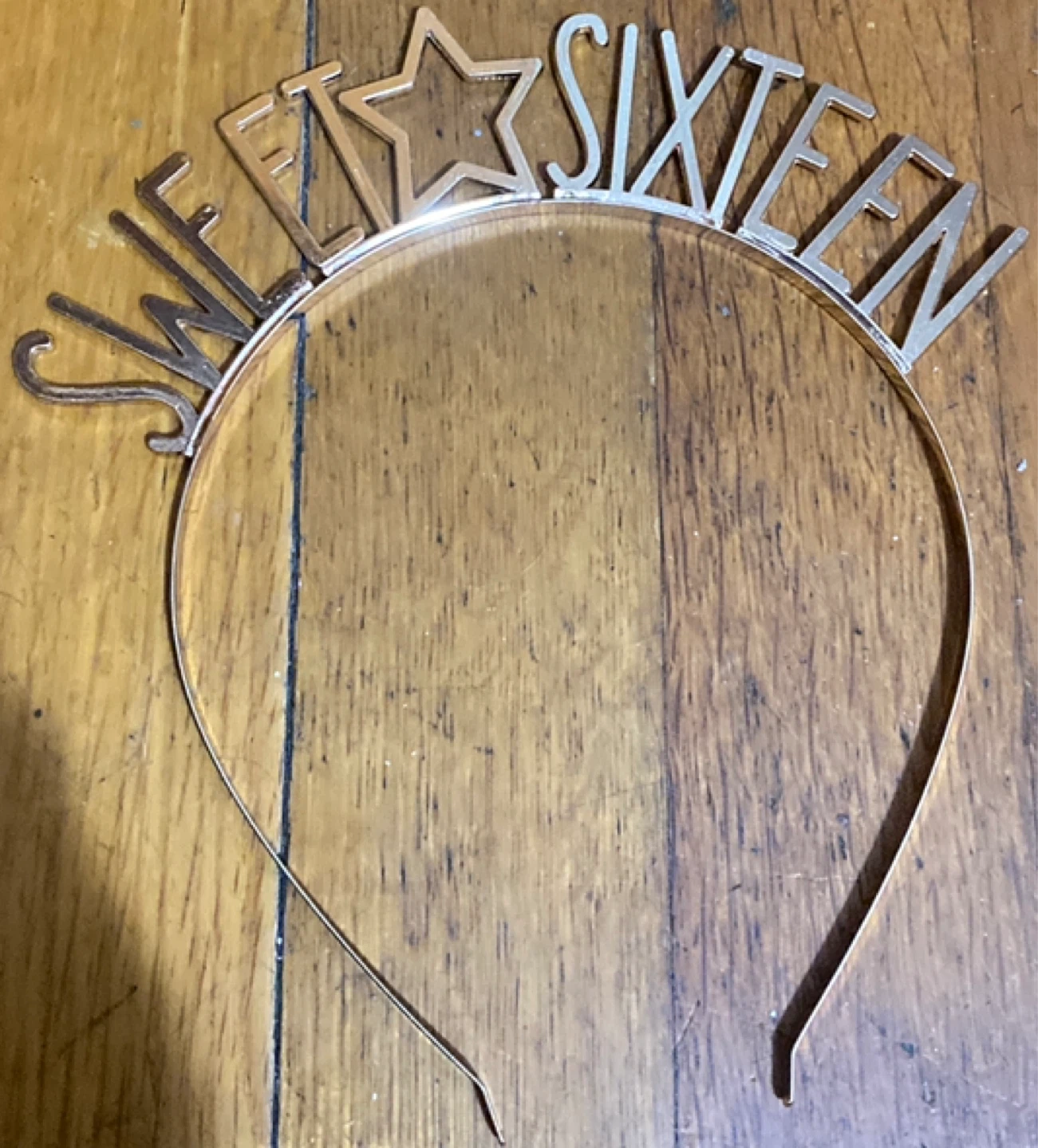 This is a rose gold 'Sweet Sixteen' tiara headband. It has a star detail above the word 'Sweet'. Makes a great accessory for a birthday celebration!