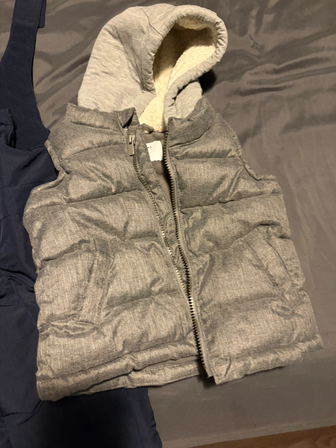 Soft grey puffer vest with a warm sherpa-lined hood. 18-24 months. It's perfect for layering on cooler days. black jacket size 2T. snowpants 12-18M.