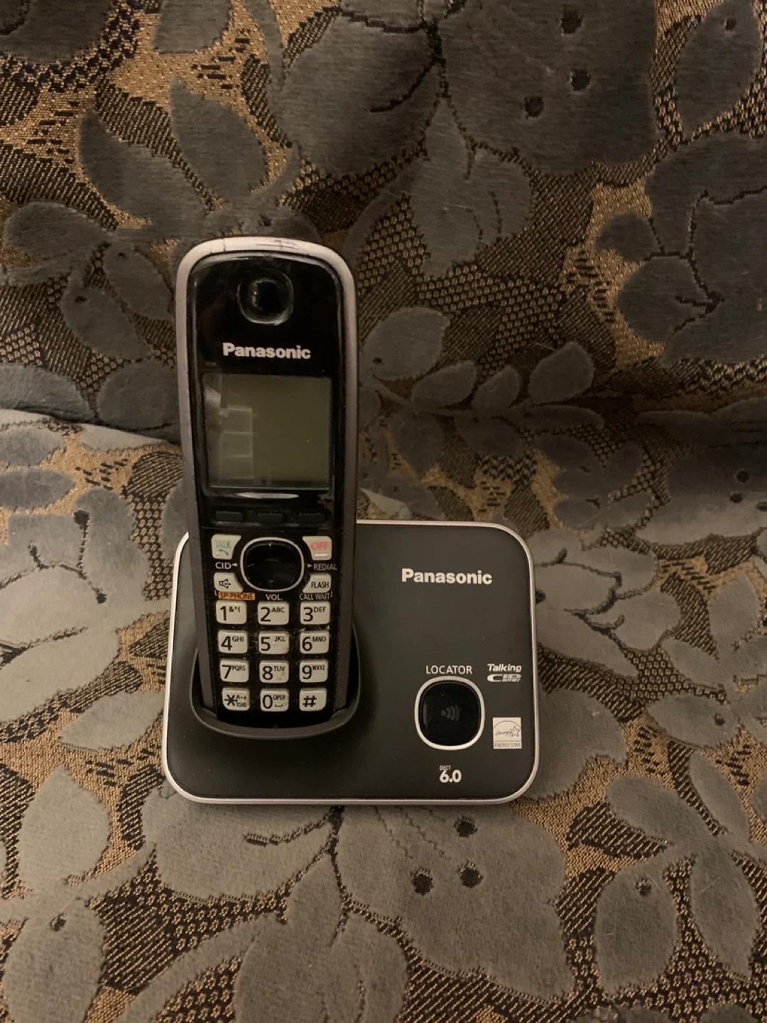 Panasonic cordless phone with base and handset. Model KX-T411C. It uses 2 AAA batteries, not included. Features talking caller ID and DECT 6.0.