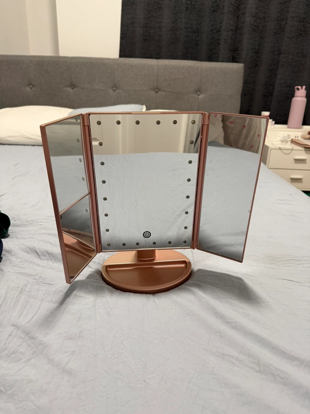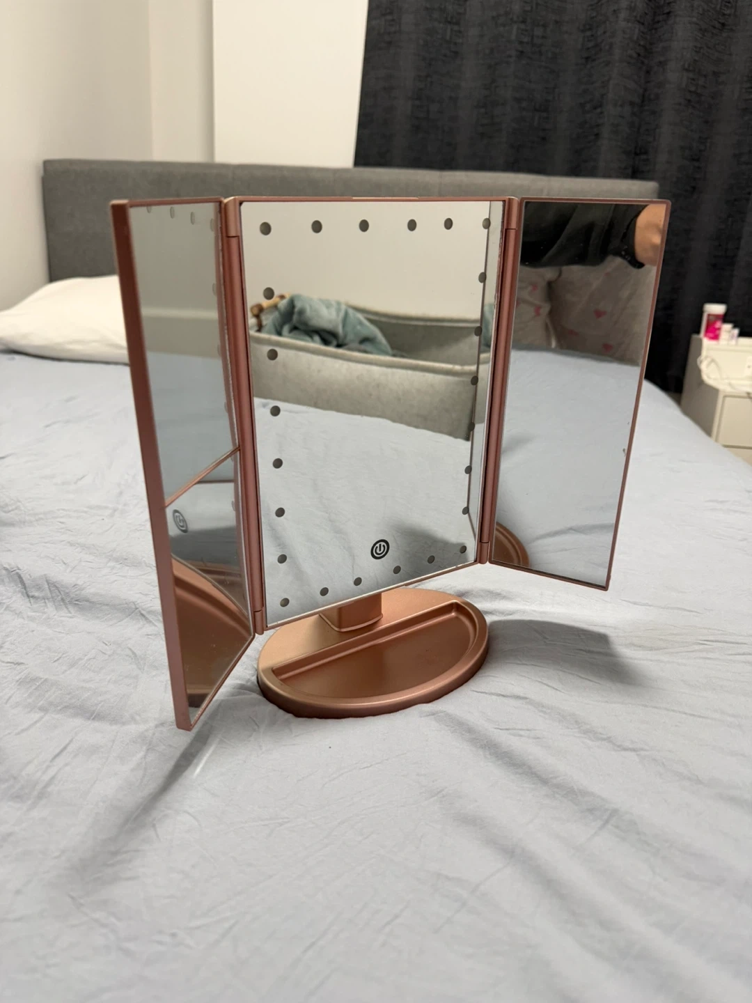 This tri-fold makeup mirror features built-in LED lights for enhanced visibility. It's rose gold colored and has a convenient tri-fold design for easy storage and portability. The base provides stable support for tabletop use.
