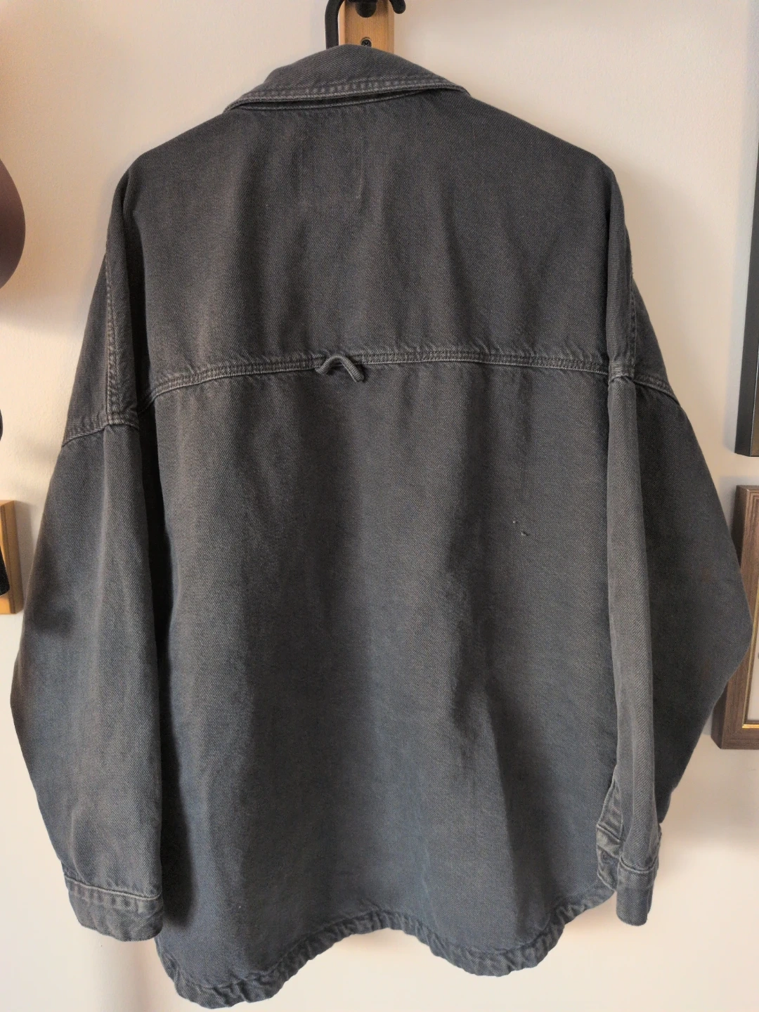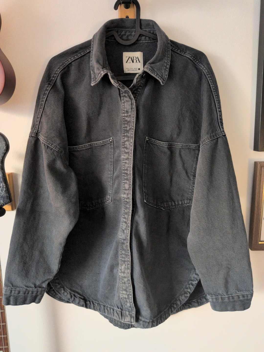 ZARA oversized denim shirt. Black wash colour. Two chest pockets. Cotton material. Button-up front. 2 minor pulls on the back. Size medium.