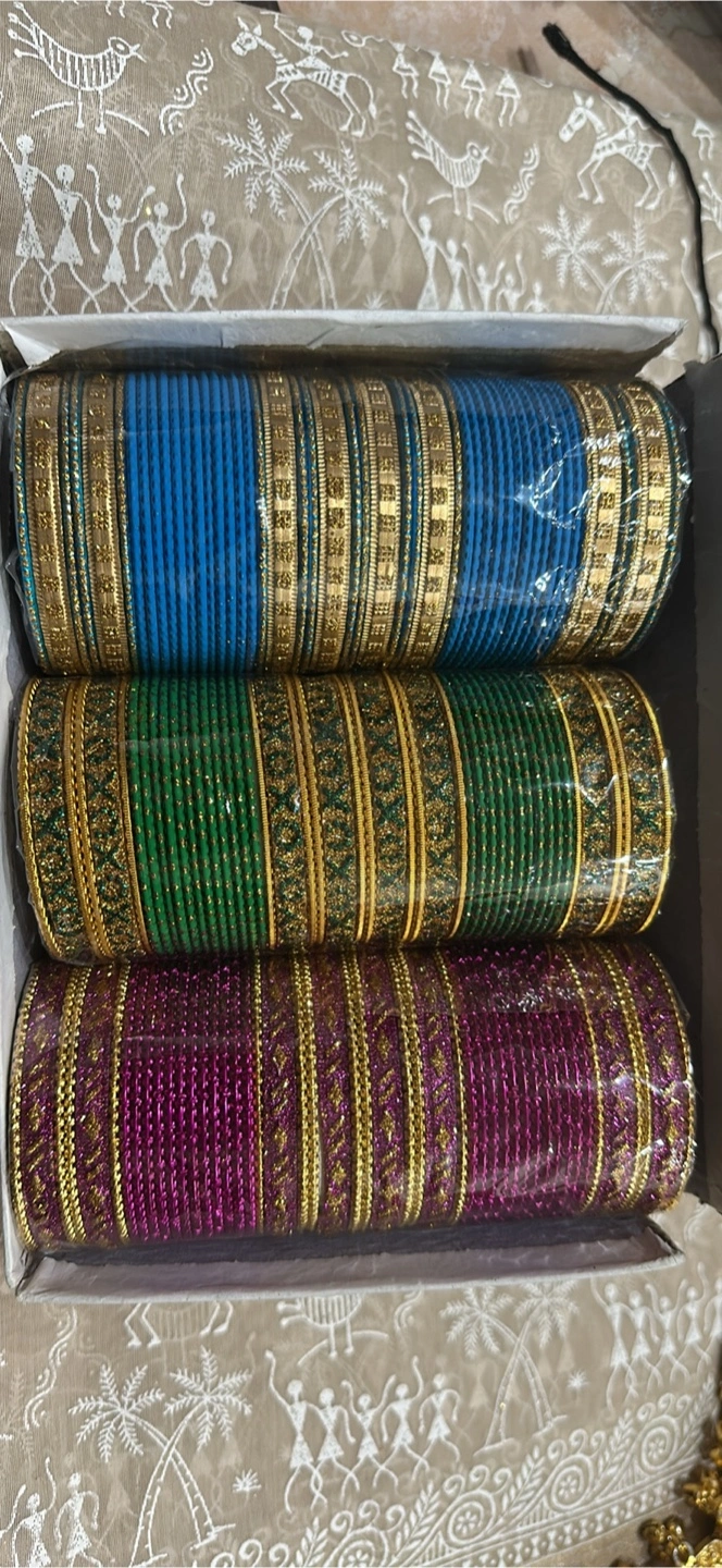 Selling a set of bangles in three beautiful colours: blue, green, and purple! These bangles come in a box, making them easy to store and keep organized. They're perfect for adding a touch of colour and elegance to any outfit