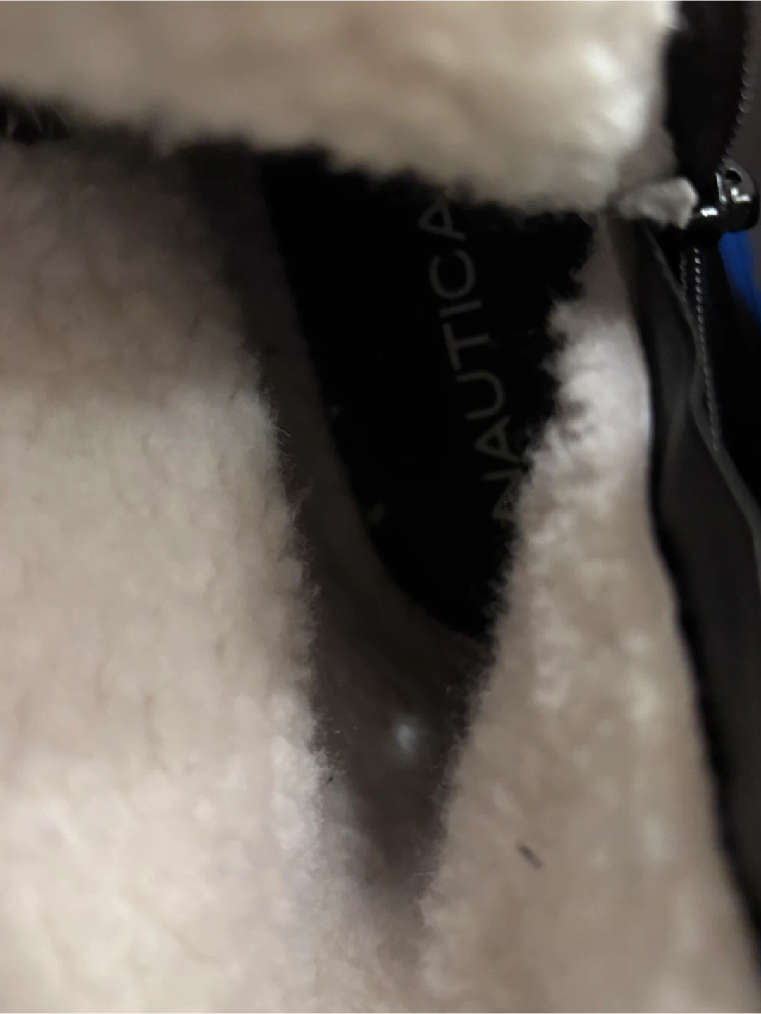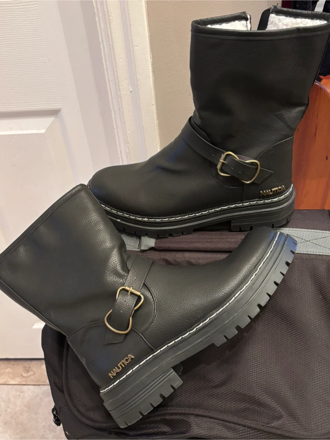 Nautica black winter boots with cozy sherpa lining. They feature a side zipper and buckle detail. Durable lug sole.