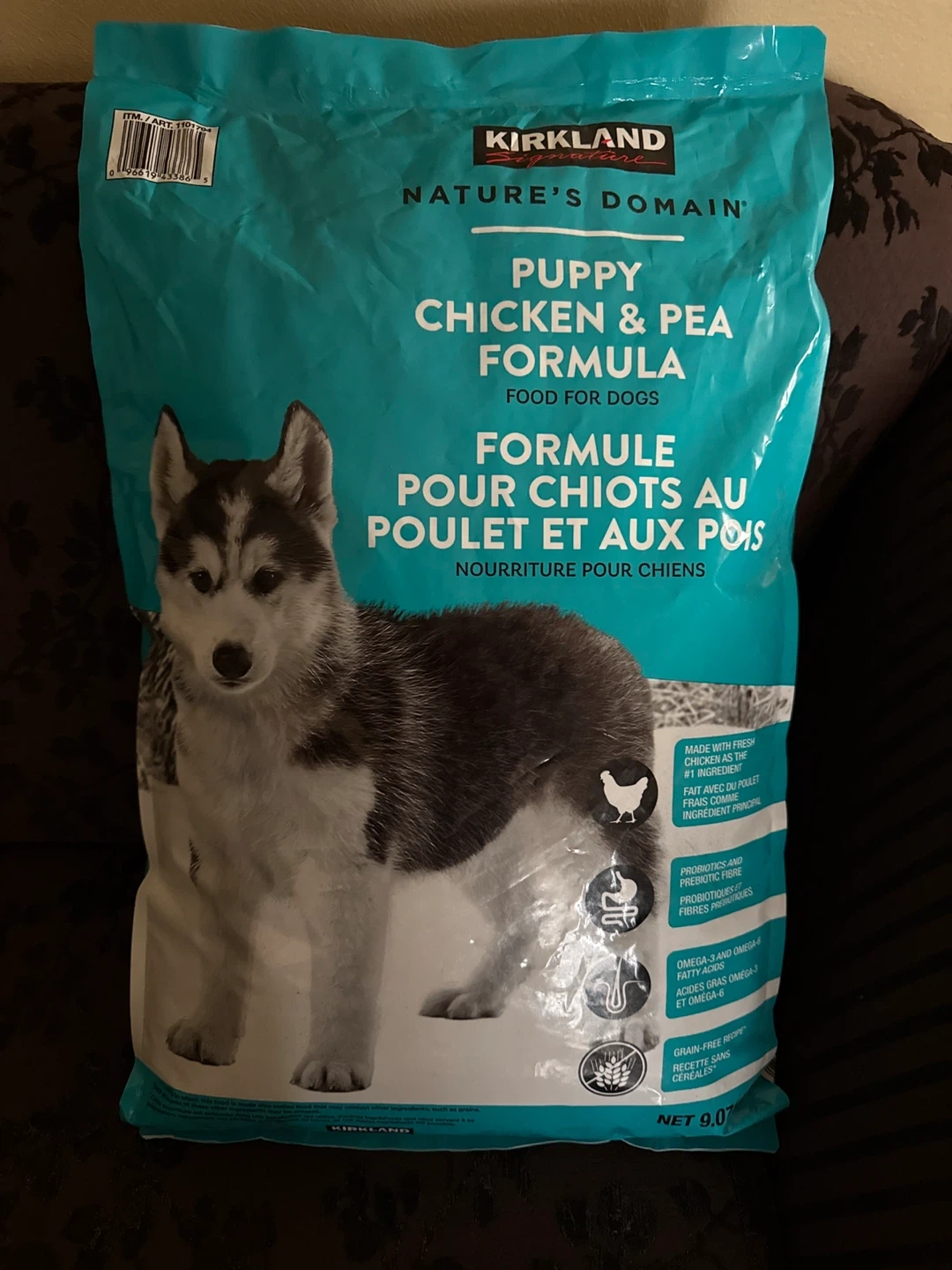Kirkland Signature Nature's Domain puppy food with chicken and pea formula. It's a grain-free recipe made with fresh chicken as the #1 ingredient. Includes probiotics, prebiotic fibre, and omega-3 and omega-6 fatty acids. Net weight is 9.07 kg.