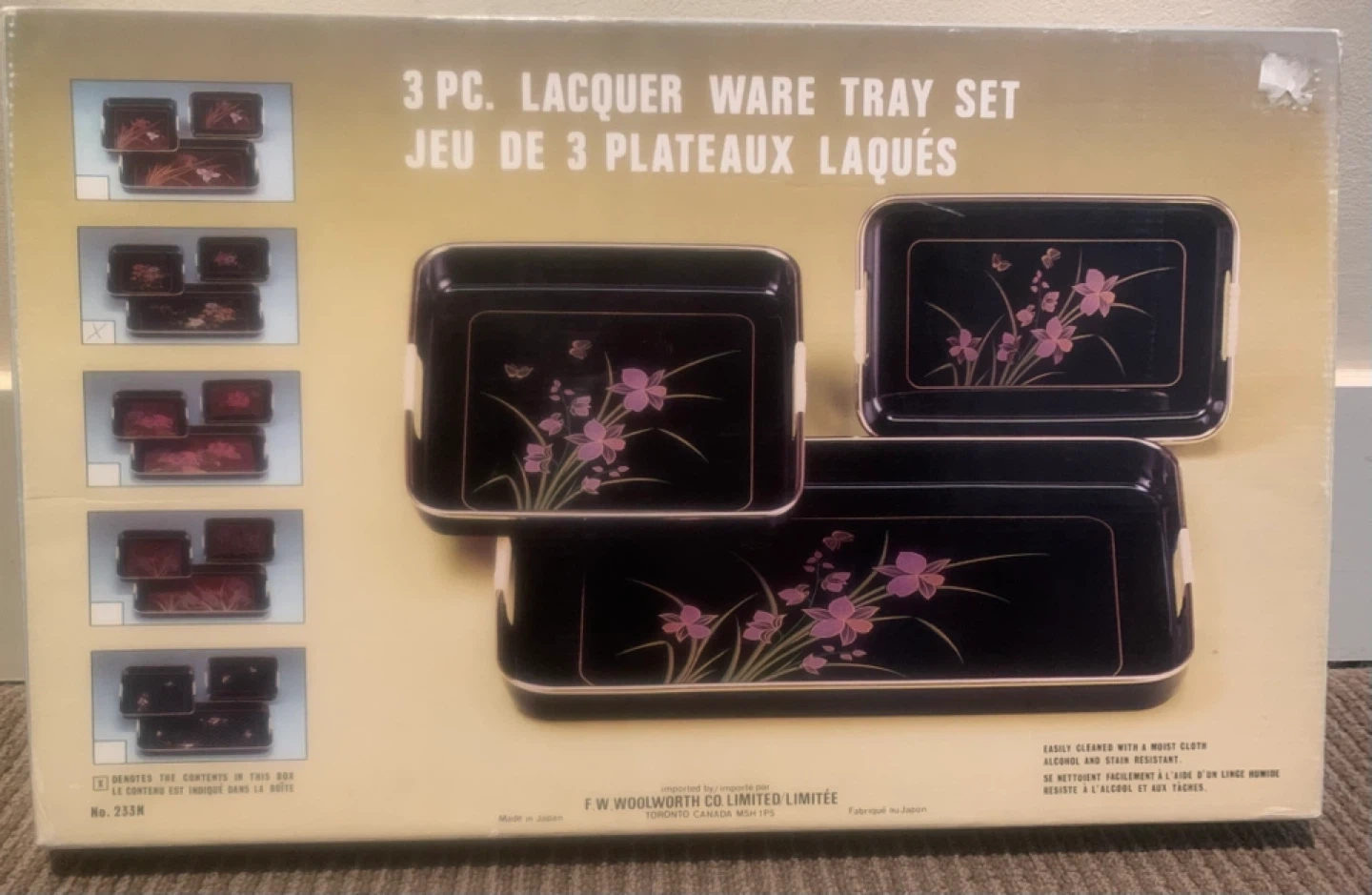 Vintage Shiny black lacquer tray set in box. Comes as a 3 piece set. Made in Japan for F.W. Woolworth Co.