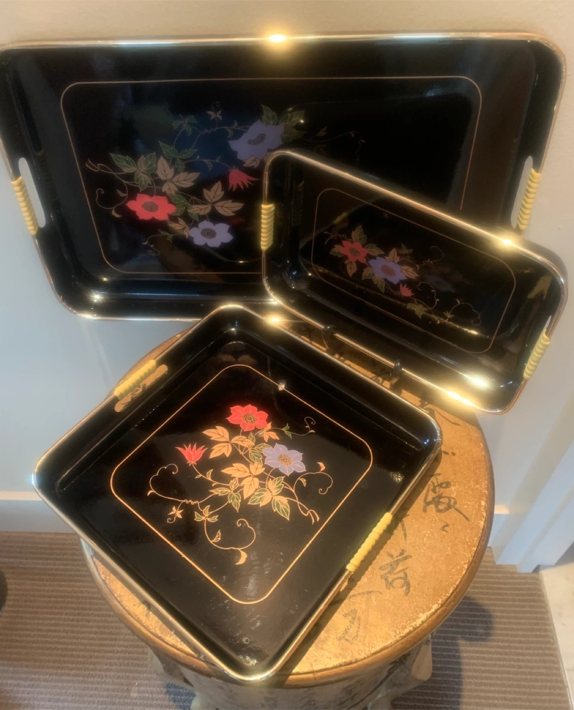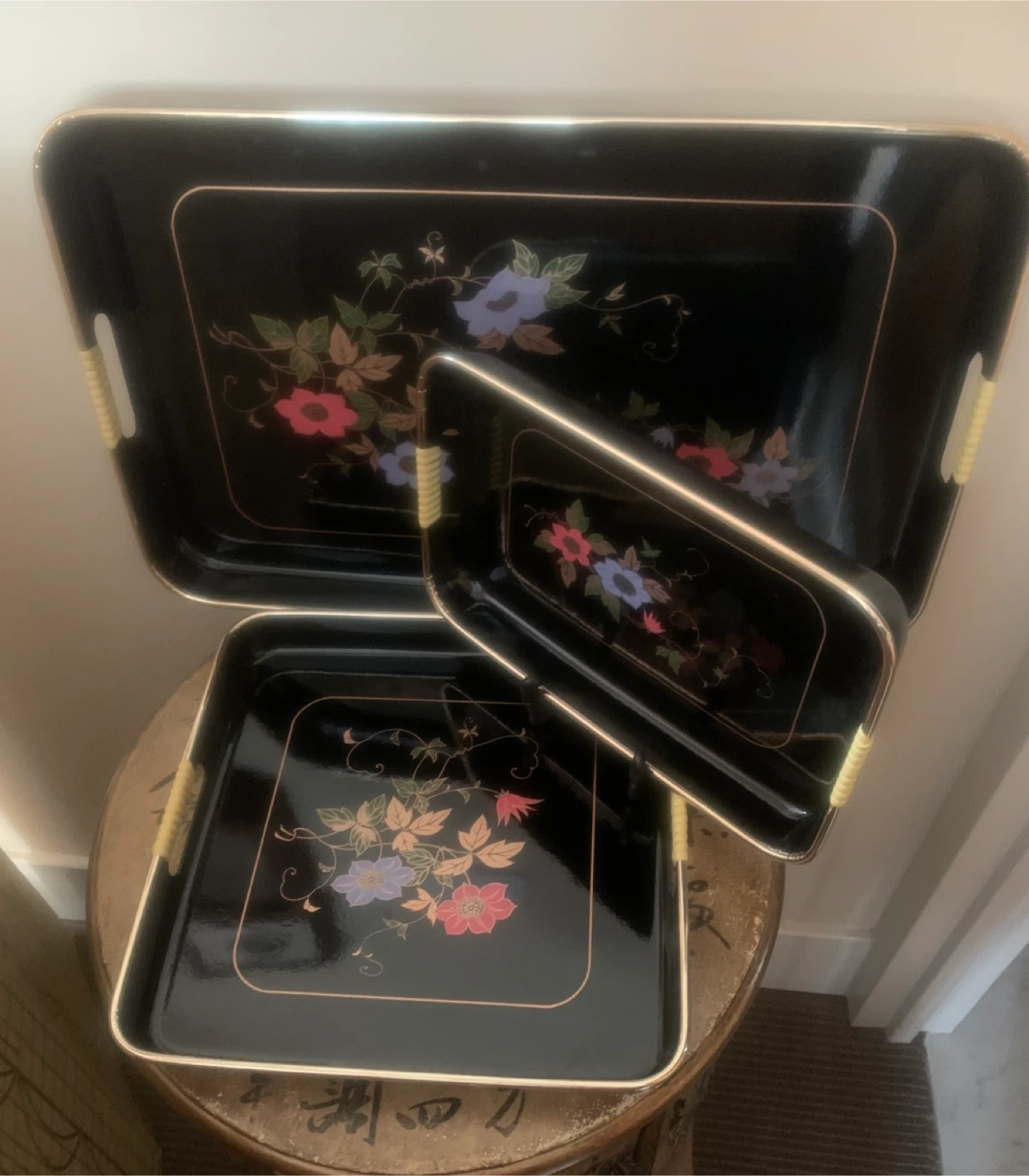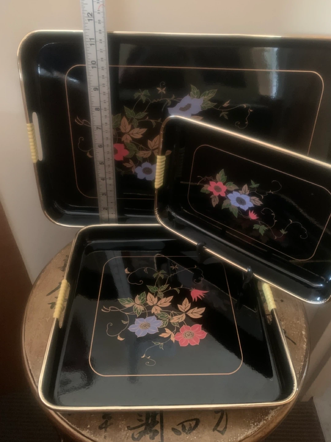 Vintage Black Lacquer Floral Serving Trays 3 PC Set