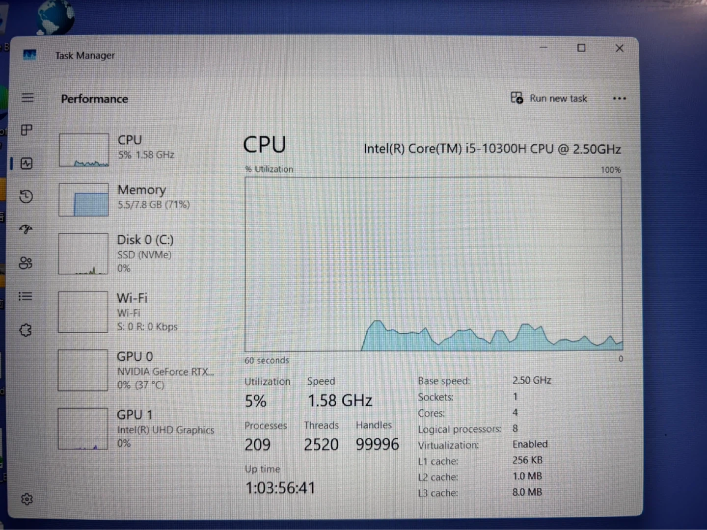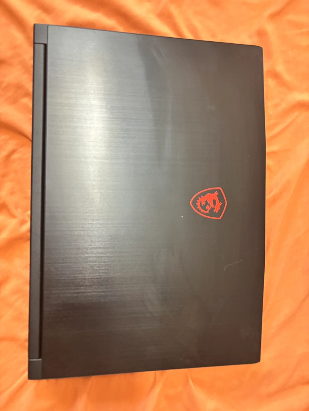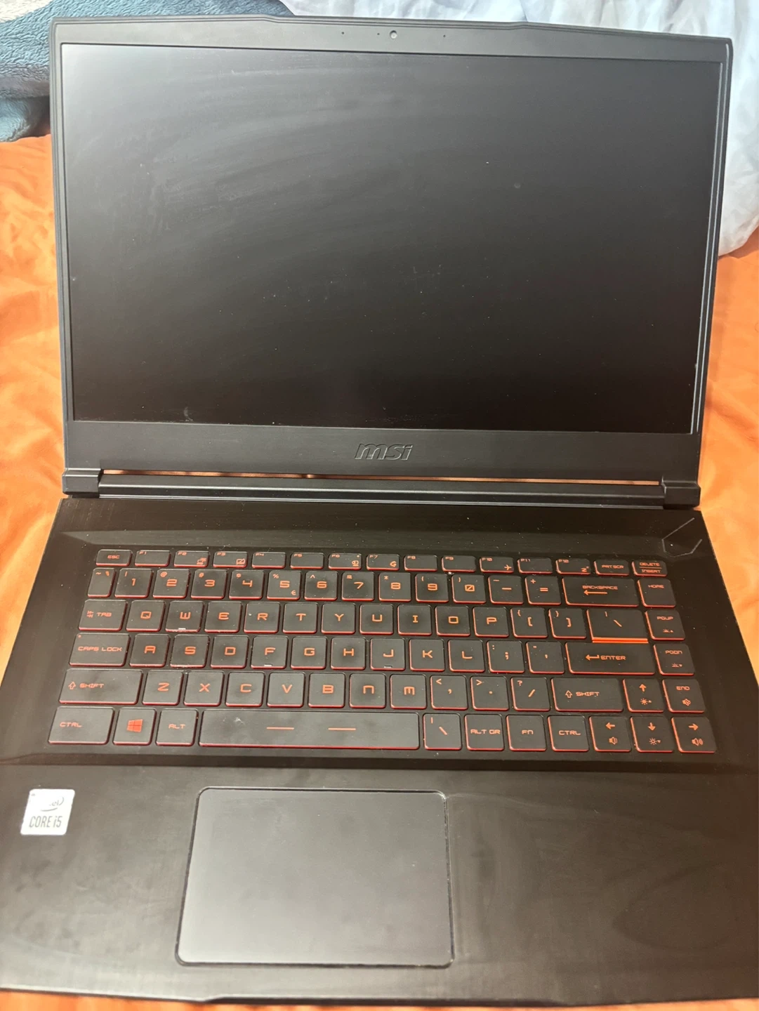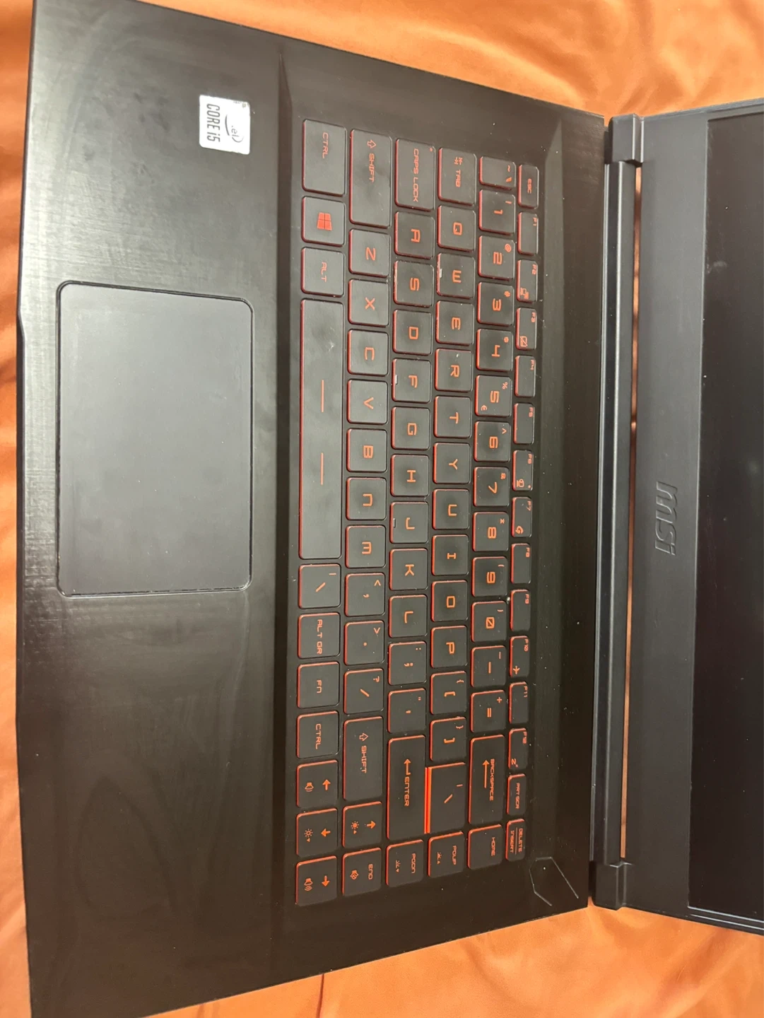 MSI GF65 Thin 10UE laptop with an Intel Core i5-10300H CPU and 8GB RAM. It features a GeForce RTX graphics card. Black finish with red backlit keyboard.