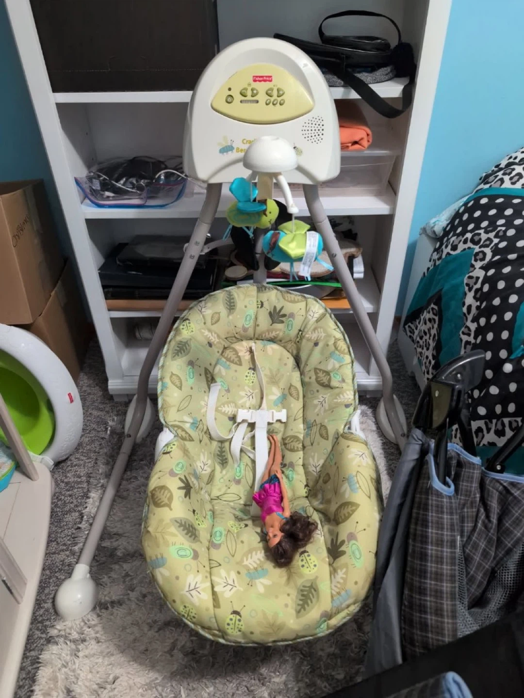 This Fisher-Price baby swing features a comfortable seat with a light green, nature-themed print. It has multiple swing speeds and music options. The seat pad is removable for cleaning. It's a soothing option for little ones.