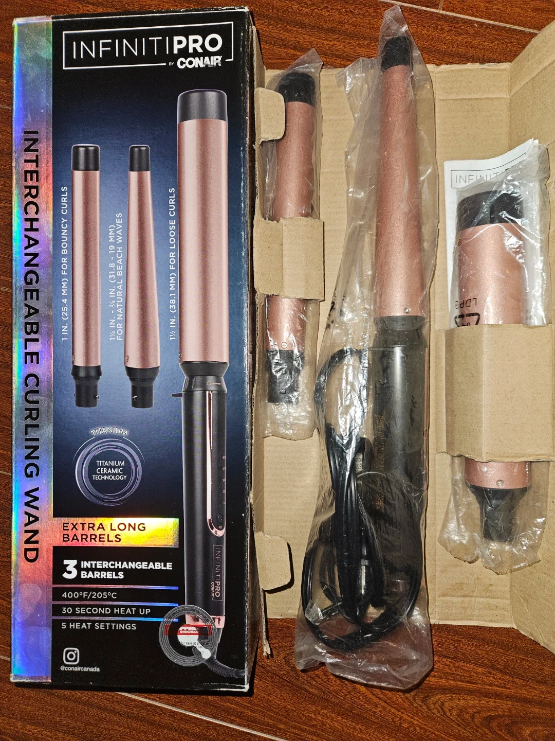 This InfinitiPro by Conair curling wand comes with 3 interchangeable barrels for different curl types. It features titanium ceramic technology for fast heat-up and 5 heat settings. The wand has extra-long barrels and reaches up to 400°F (205°C) with a 30-second heat-up time.