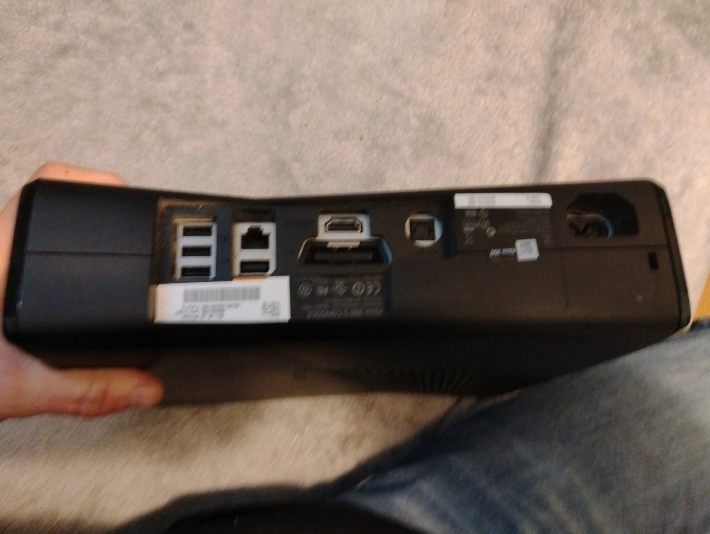 This is an Xbox 360 gaming console. It's black and has multiple ports on the back for connectivity. This console is ready for your game collection! No wires or controls included
