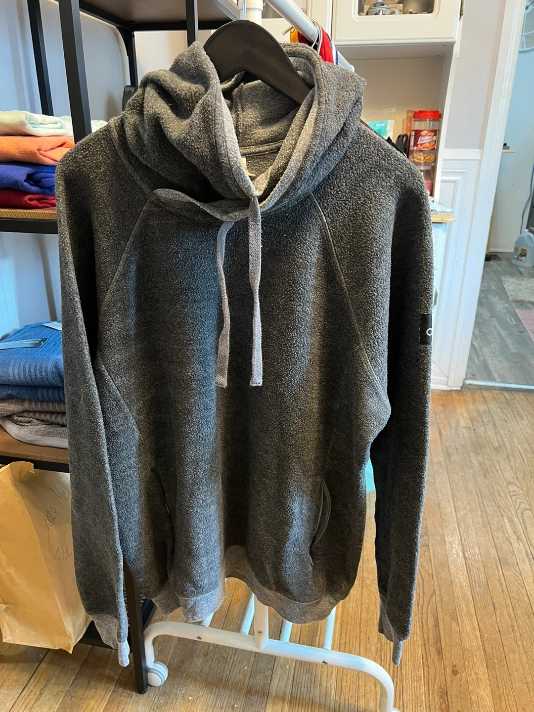 Alo Yoga fleece hoodie in a heather grey colour. It's a pullover style with a drawstring hood and front pouch pocket. The material feels soft and is perfect for staying cosy.