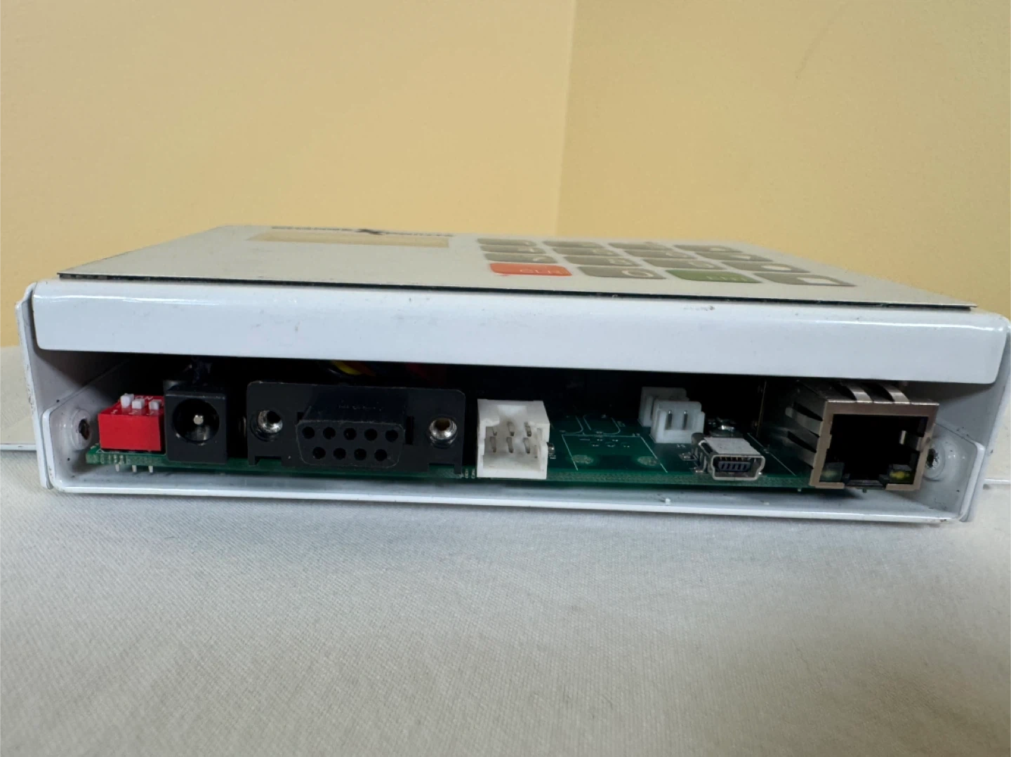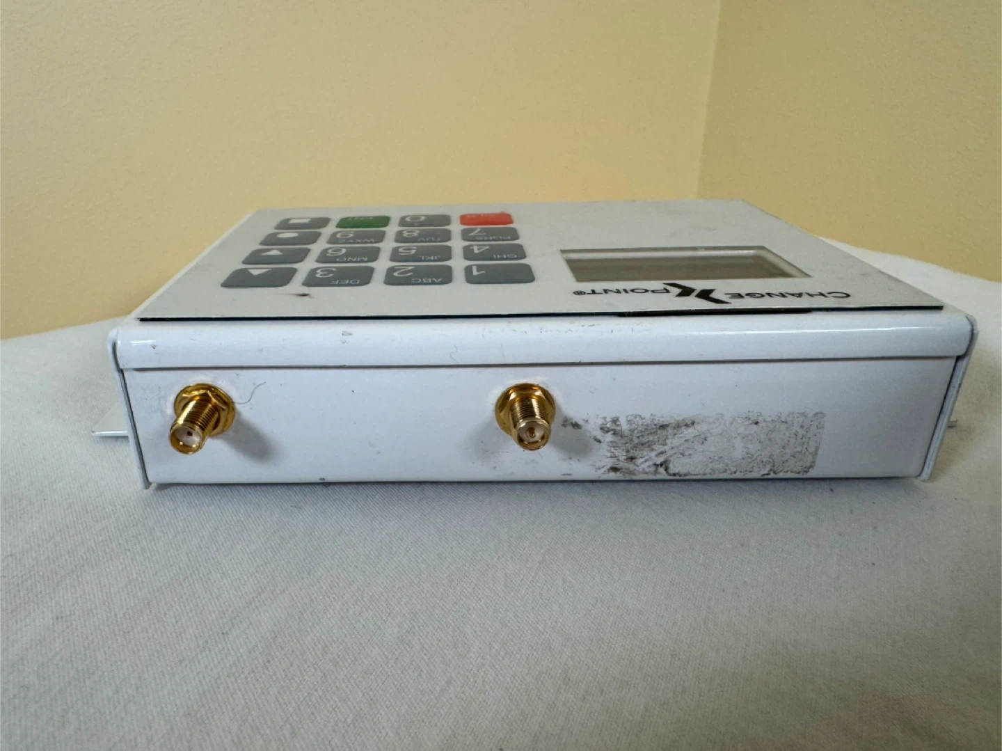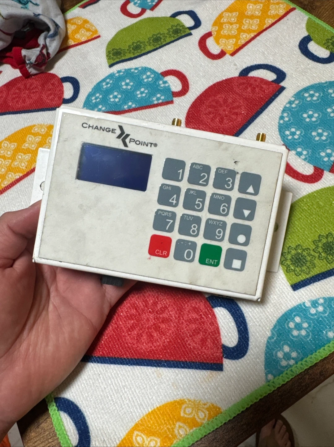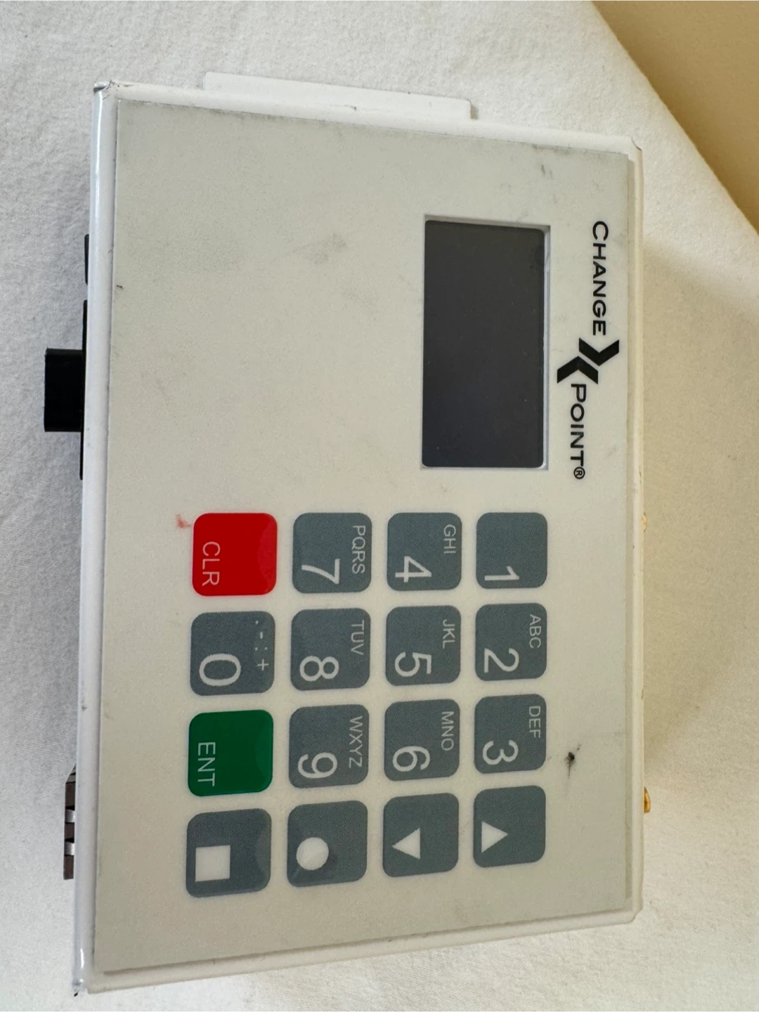 This is a Change Point keypad device. It features a numeric keypad and a small display screen. The device has various input/output ports on the side and bottom.