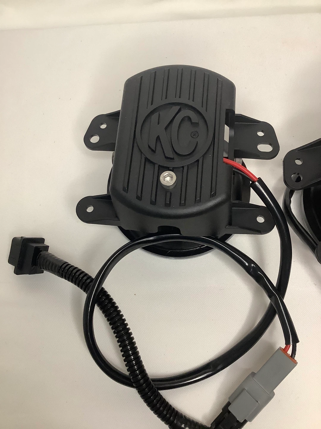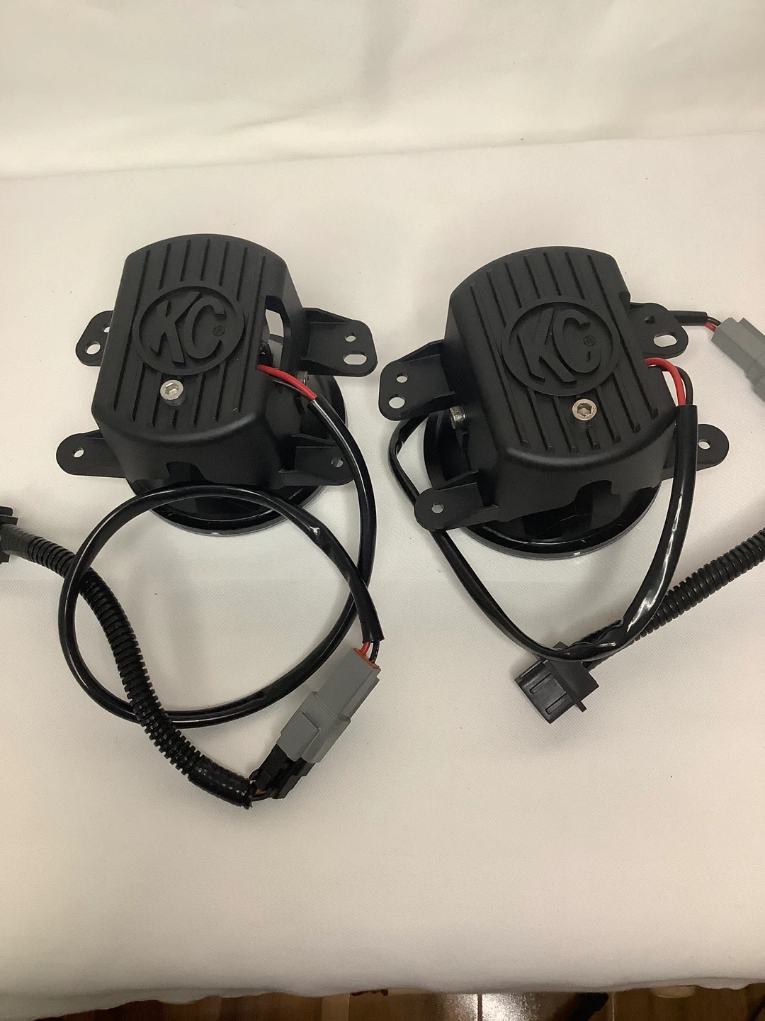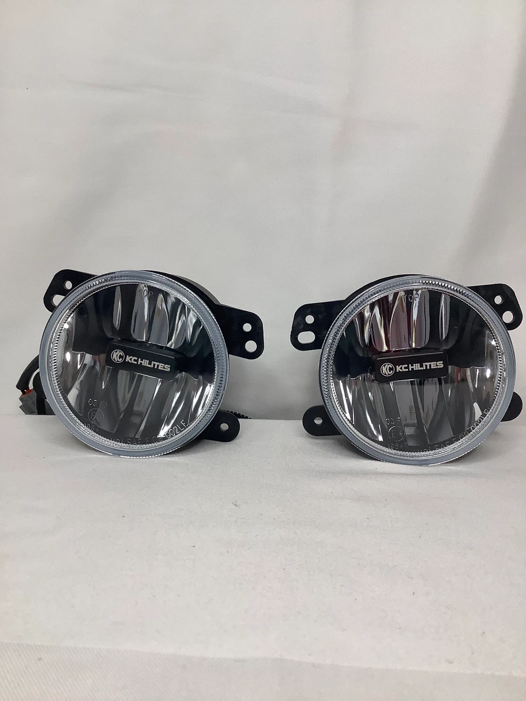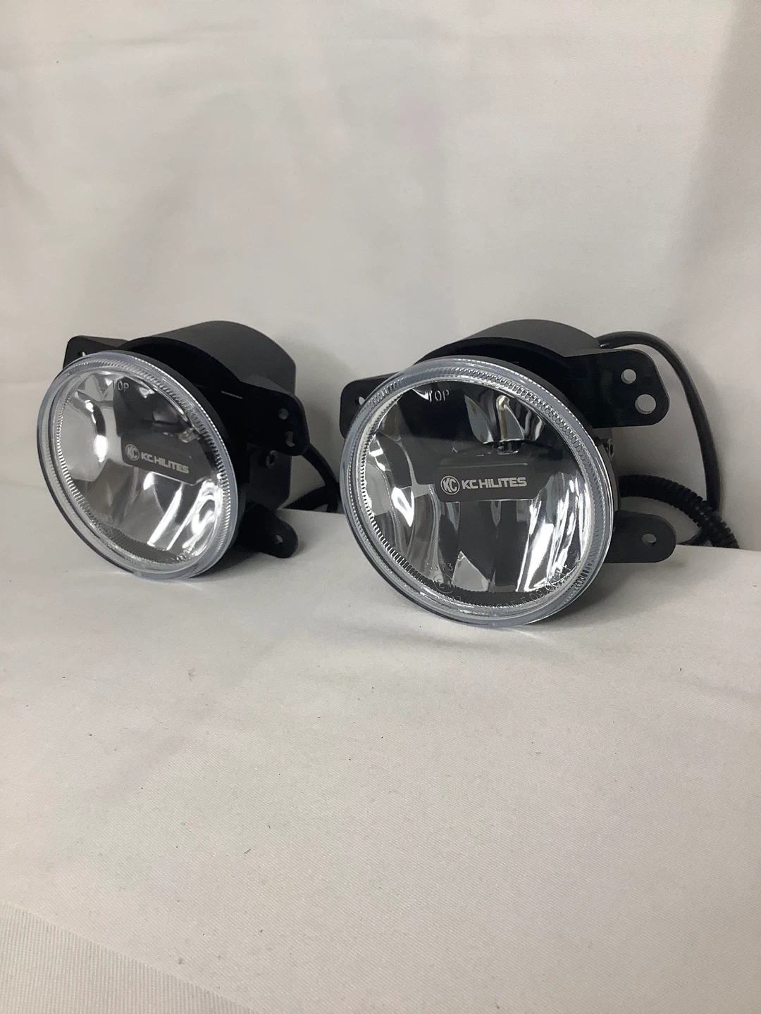 A pair of KC HiLiTES fog lights. They feature a black housing with clear lenses. Includes wiring harnesses.