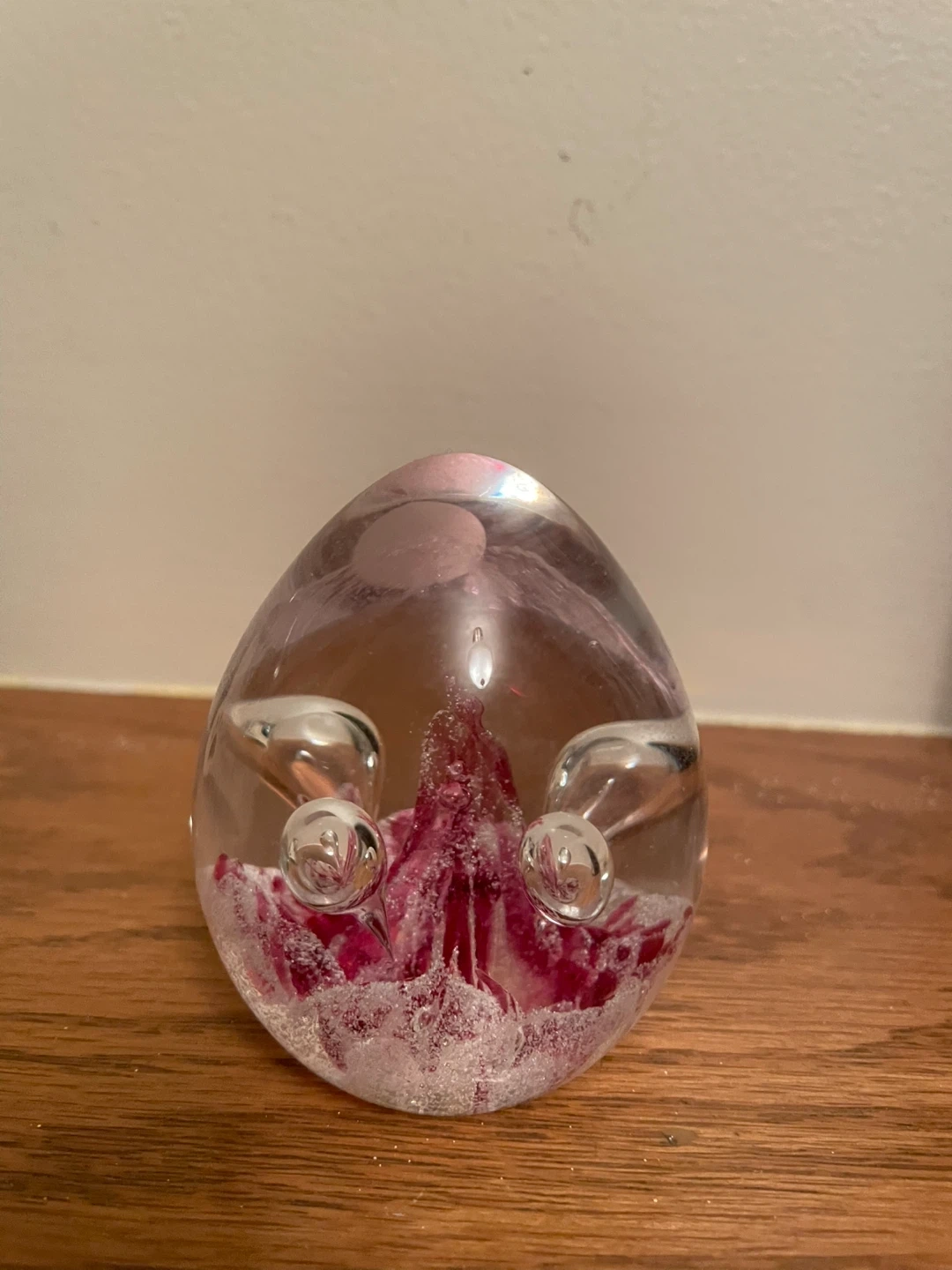 Decorative glass paperweight with embedded pink floral elements and air bubbles. Adds a touch of elegance to any desk or shelf. Perfect for holding down papers or as a standalone display piece!