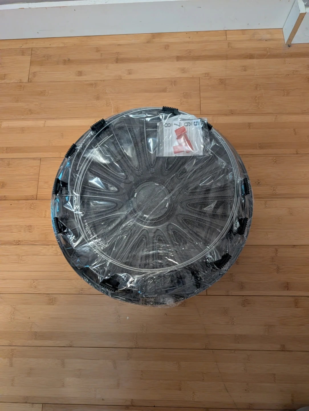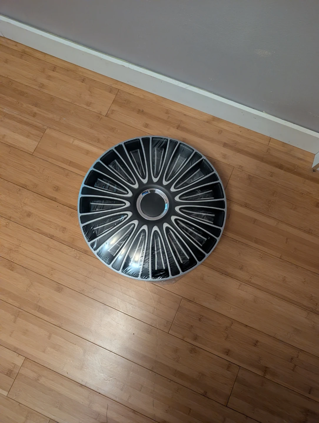 This is a set of four hubcaps with a black and silver design. They are 17-inch, suitable for many vehicles. They're still in their original plastic wrapping. Bought them and could not return didn't know they were the wrong size